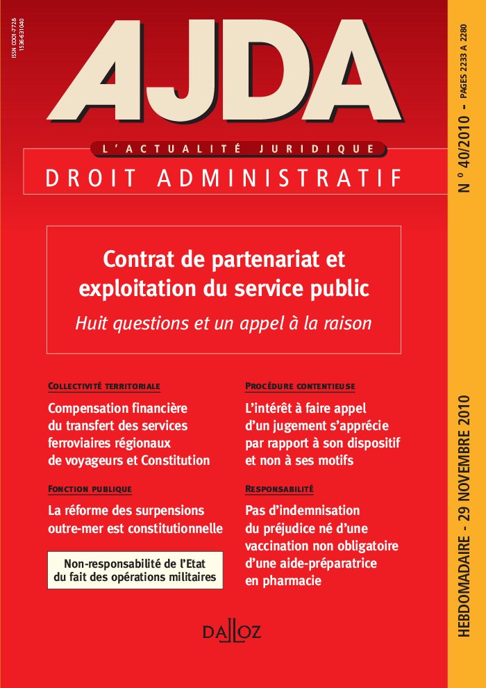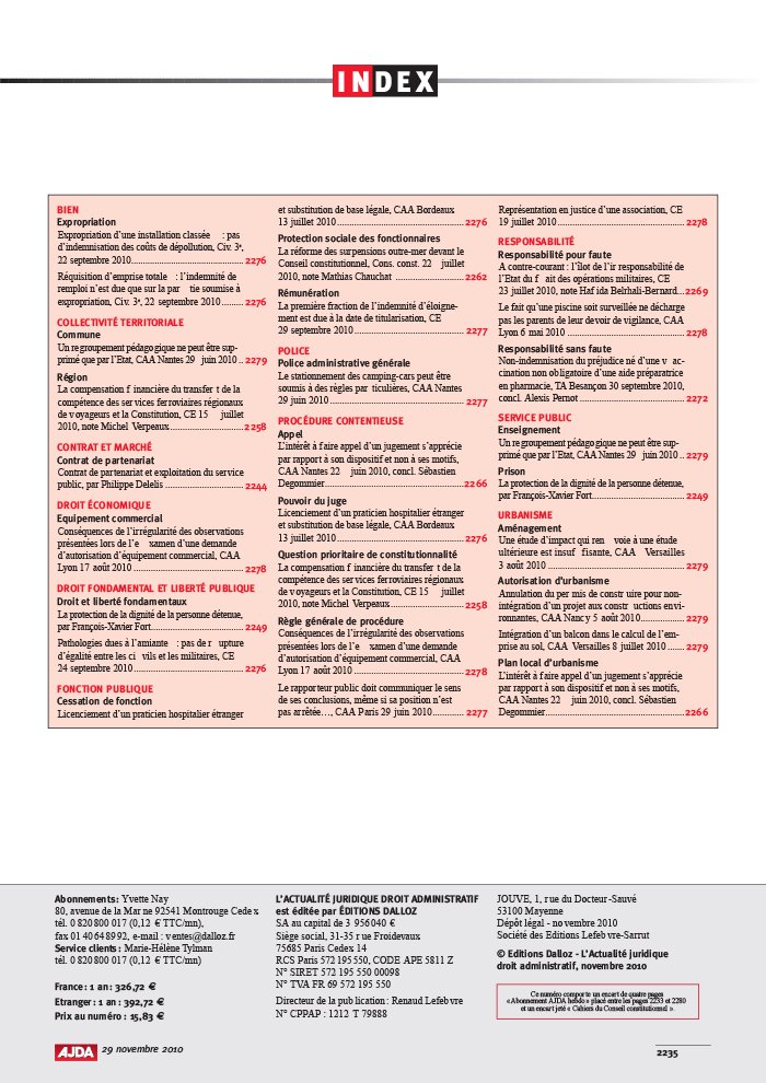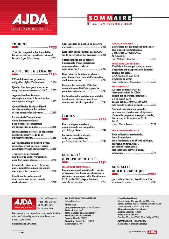 TRIBUNE 2233 Transfert du patrimoine immobilier : les universités auront- elles ( vraiment) le choix ?, par Marc Joyau . 2233 AU FIL DE LA SEMAINE 2236 L’Etat doit tenir ses promesses malgré les règles d’urbanisme. 2236 Quelles fonctions peut exercer un magistrat maintenu en activité ? . 2237 Application dans le temps des règles relatives à la motivation des requêtes d’appel . 2237 Quand Nicolas Sarkozy défend ses réformes devant les maires… et leur annonce les suivantes . 2238 Le retrait de l’autorisation de stationnement de taxi pour absence d’exploitation est une mesure de police . 2238 Hospitalisation d’office : la séparation des juridictions viole le droit au recours effectif . 2239 Le fonctionnaire ne peut être radié des cadres avant que sa privation des droits civiques soit définitive . 2239 Transferts de personnels de l’Etat : un rapport s’inquiète pour les finances locales. 2240 Légalité des titres de recettes émis par le comptable qui a reçu quitus par le juge des comptes. 2240 Condition de reclassement d’un enseignant déclaré inapte médicalement . 2240 Conséquences de l’action en désaveu d’avocat. 2241 Responsabilité médicale : pas de QPC sur la prescription des créances. 2241 Comment prendre en compte l’ancienneté d’un ressortissant communautaire reclassé dans un corps ? . 2242 Illustration de la notion de clause exorbitante d’un contrat d’occupation du domaine privé. 2242 Censure des modalités d’élection au comité consultatif des sapeurs-pompiers volontaires . 2243 Le fonctionnaire maintenu en activité ayant assez cotisé n’acquiert pas de nouveaux droits à pension . 2243 ÉTUDES 2244 Contrat de partenariat et exploitation du service public, par Philippe Delelis . 2244 La protection de la dignité de la personne détenue, par François- Xavier Fort . 2249 ACTUALITÉ JURISPRUDENTIELLE 2258 COLLECTIVITÉ TERRITORIALE La compensation financière du transfert de la compétence des services ferroviaires régionaux de voyageurs et la Constitution, CE 15 juillet 2010, Région Lorraine, note Michel Verpeaux. 2258 FONCTION PUBLIQUE La réforme des surpensions outre- mer et le Conseil constitutionnel, Cons. const. 22 juillet 2010, M. Cachard, note Mathias Chauchat . 2262 PROCÉDURE CONTENTIEUSE L’intérêt à faire appel d’un jugement s’apprécie par rapport à son dispositif et non à ses motifs, CAA Nantes 22 juin 2010, Commune de Theix, concl. Sébastien Degommier. 2266 RESPONSABILITÉ A contre- courant : l’îlot de l’irresponsabilité de l’Etat du fait des opérations militaires, CE 23 juillet 2010, Société Touax, Société Touax Rom, note Hafida Belrhali- Bernard. 2269 Non- indemnisation du préjudice né d’une vaccination non obligatoire d’une aide préparatrice en pharmacie, TA Besançon 30 septembre 2010, Mme P., concl. Alexis Pernot. 2272 VEILLE JURISPRUDENTIELLE Bien, collectivité territoriale, droit économique, droit fondamental et liberté publique, fonction publique, police, procédure contentieuse, responsabilité, service public, urbanisme. 2276 ACTUALITÉ BIBLIOGRAPHIQUE 2280 par Guylain Clamour, Jean- Claude Ricci et Jérôme Tremeau . 2280 31- 35, rue Froidevaux, 75685 Paris Cedex 14 tél. 01 40 64 54 54, fax 01 40 64 54 66 Pour joindre un correspondant, composez le 01 40 64 suivi des chiffres figurant à la suite de son nom. E. mail : aj@ dalloz. fr Hebdomadaire 66e année PRÉSIDENT- DIRECTEUR GÉNÉRAL Renaud Lefebvre RÉDACTION Directeur scientifique : Yves Jégouzo Rédactrice en chef : Marie- Christine de Montecler ( 5474) Rédactrice en chef adjointe : Séverine Brondel ( 5405) Rédaction: Carine Biget ( 5435), Rémi Grand ( 5306) Conseil scientifique : Marine Dorne- Corraze, Bernard Dreyfus, Etienne Fatôme, Marcel Pochard, Laurent Richer, Didier Truchet, Charles- Louis Vier Rédactrice en chef technique: Béatrice Lapouille ( 5338) Secrétaires d’édition : Caroline Charrier ( 5368), Elsa Lebigot ( 5380) ABONNEMENTS - MARKETING Marketing : Christelle Gendraud 2234 29 novembre 2010 BIEN Expropriation Expropriation d’une installation classée: pas d’indemnisation des coûts de dépollution, Civ. 3e, 22 septembre 2010. 2276 Réquisition d’emprise totale: l’indemnité de remploi n’est due que sur la partie soumise à expropriation, Civ. 3e, 22 septembre 2010 . 2276 COLLECTIVITÉ TERRITORIALE Commune Un regroupement pédagogique ne peut être sup-primé que par l’Etat, CAA Nantes 29 juin 2010.. 2279 Région La compensation financière du transfert de la compétence des services ferroviaires régionaux de voyageurs et la Constitution, CE 15 juillet 2010, note Michel Verpeaux . 2258 CONTRAT ET MARCHÉ Contrat de partenariat Contrat de partenariat et exploitation du service public, par Philippe Delelis. 2244 DROIT ÉCONOMIQUE Equipement commercial Conséquences de l’irrégularité des observations présentées lors de l’examen d’une demande d’autorisation d’équipement commercial, CAA Lyon 17 août 2010 . 2278 DROIT FONDAMENTAL ET LIBERTÉ PUBLIQUE Droit et liberté fondamentaux La protection de la dignité de la personne détenue, par François- Xavier Fort. 2249 Pathologies dues à l’amiante: pas de rupture d’égalité entre les civils et les militaires, CE 24 septembre 2010. 2276 FONCTION PUBLIQUE Cessation de fonction Licenciement d’un praticien hospitalier étranger et substitution de base légale, CAA Bordeaux 13 juillet 2010 . 2276 Protection sociale des fonctionnaires La réforme des surpensions outre- mer devant le Conseil constitutionnel, Cons. const. 22 juillet 2010, note Mathias Chauchat . 2262 Rémunération La première fraction de l’indemnité d’éloigne-ment est due à la date de titularisation, CE 29 septembre 2010. 2277 POLICE Police administrative générale Le stationnement des camping- cars peut être soumis à des règles particulières, CAA Nantes 29 juin 2010 . 2277 PROCÉDURE CONTENTIEUSE Appel L’intérêt à faire ap
