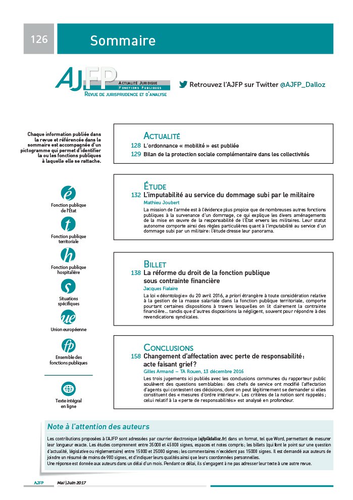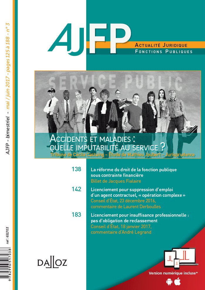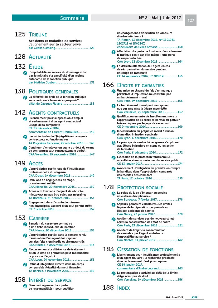 ACTUALITÉ 128 L’ordonnance « mobilité » est publiée 129 Bilan de la protection sociale complémentaire dans les collectivités ÉTUDE 132 L’imputabilité au service du dommage subi par le militaire Mathieu Joubert La mission de l’armée est à l’évidence plus propice que de nombreuses autres fonctions publiques à la survenance d’un dommage, ce qui explique les divers aménagements de la mise en oeuvre de la responsabilité de l’État envers les militaires. Leur statut autonome comporte ainsi des règles particulières quant à l’imputabilité au service d’un dommage subi par un militaire : l’étude dresse leur panorama. BILLET 138 La réforme du droit de la fonction publique sous contrainte financière Jacques Fialaire La loi « déontologie » du 20 avril 2016, a priori étrangère à toute considération relative à la gestion de la masse salariale dans la fonction publique territoriale, comporte pourtant certaines dispositions à travers lesquelles on lit clairement la contrainte financière… tandis que d’autres dispositions la négligent, souvent pour répondre à des revendications syndicales. CONCLUSIONS 158 Changement d’affectation avec perte de responsabilité : acte faisant grief ? Gilles Armand – TA Rouen, 13 décembre 2016 Les trois jugements ici publiés avec les conclusions communes du rapporteur public soulèvent des questions semblables : des chefs de service ont modifié l’affectation d’agents qui contestent ces décisions, dont on peut légitimement se demander si elles constituent des « mesures d’ordre intérieur » . Les critères de la notion sont rappelés ; celui relatif à la « perte de responsabilités » est analysé en profondeur. 125 TRIBUNE Accidents et maladies de service : l’alignement sur le secteur privé par Cécile Castaing . 125 128 ACTUALITÉ 132 ÉTUDE L’imputabilité au service du dommage subi par le militaire : la spécificité d’un régime autonome de la fonction publique par Mathieu Joubert . 132 138 POLITIQUES GÉNÉRALES La réforme du droit de la fonction publique sous contrainte financière : jusqu’où ? billet de Jacques Fialaire . 138 142 AGENTS CONTRACTUELS Licenciement pour suppression d’emploi et reclassement d’un agent contractuel : l’éloge de la complexité CE 23 décembre 2016, commentaire de Laurent Derboulles . 142 Les vicissitudes de l’( in) égalité entre agents contractuels et fonctionnaires TA Polynésie française, 25 octobre 2016 . 146 Continuer d’employer un agent au- delà du terme de son contrat vaut renouvellement verbal CAA Versailles, 29 septembre 2016. 147 149 ACCÈS L’appréciation par le juge de l’insuffisance professionnelle du stagiaire CAA Douai, 1er décembre 2016 . 149 Deux ans de négligences en stage : licenciement justifié CAA Marseille, 29 novembre 2016 . 150 Accès aux fonctions d’adjoint de sécurité : mieux vaut ne pas être sujet aux migraines TA Bordeaux, 31 octobre 2016 . 151 Engagement dans l’armée de mineurs non émancipés : l’accord d’un seul parent suffit CE 7 octobre 2016 . 152 153 CARRIÈRE Sanction du caractère sommaire d’une fiche individuelle de notation CAA Nancy, 20 décembre 2016 . 153 L’appréciation portée dans le compte rendu d’évaluation d’un agent doit reposer sur des faits significatifs et circonstanciés CAA Nantes, 7 décembre 2016 . 154 Reclassement : la différence de traitement selon la date de promotion peut méconnaître le principe d’égalité CAA Lyon, 24 novembre 2016 . 155 Refus d’intégration directe dans un corps comparable : légalité du motif financier TA Rennes, 3 novembre 2016 . 156 158 INTÉRÊT DU SERVICE Comment apprécier la « perte de responsabilités » pour qualifier 127 un changement d’affectation de « mesure d’ordre intérieur » ? TA Rouen, 13 décembre 2016, nos 1501941, 1502716 et 1502847, conclusions de Gilles Armand . 158 Affectation : la perte de fonctions d’encadrement n’implique pas « par elle- même » une perte de responsabilités CAA Lyon, 13 décembre 2016 . 164 La délicate affectation de l’agent en cas de réorganisation du service pendant un congé de maternité CE 14 septembre 2016, n ° 388519 . 165 166 DROITS ET GARANTIES Une mise au placard du fait d’un manque persistant d’implication ne constitue pas un harcèlement moral CAA Paris, 1er décembre 2016 . 166 Le harcèlement moral peut ne reposer que sur une mise à l’écart matérielle CAA Versailles, 22 septembre 2016 . 167 Qualification erronée de harcèlement moral : l’appréciation de « l’exercice normal du pouvoir hiérarchique » par le juge de cassation CE 9 novembre 2016 . 169 Indemnisation du préjudice moral à raison d’une discrimination syndicale CAA Lyon, 6 décembre 2016 . 170 Le principe de neutralité religieuse s’applique aux élèves infirmiers en stage ou en action de formation CAA Paris, 6 décembre 2016 . 172 Extension de la protection fonctionnelle au collaborateur occasionnel du service public CE 13 janvier 2017 . 174 Avancement : l’obligation de prendre en compte le handicap dans l’appréciation comparée des mérites des candidats TA Paris, 12 octobre 2016 . 175 178 PROTECTION SOCIALE Le refus du juge d’imputer au service un « stress disciplinaire » CAA Bordeaux, 7 février 2017 . 178 Sapeurs- pompiers volontaires : les limites légales de la réparation des préjudices liés aux accidents de service CAA Nancy, 26 janvier 2017 . 179 Accident de service : pas de nouveau congé après la consolidation de l’état de santé CAA Paris, 13 décembre 2016 . 181 Accident de trajet : la consommation de cannabis par l’agent exclut- elle l’imputabilité au service ? CAA Nantes, 31 janvier 2017 . 182 183 CESSATION DE FONCTIONS Licenciement pour insuffisance professionnelle d’un agent titulaire : la recherche préalable d’un reclassement n’est plus requise CE 18 janvier 2017, commentaire d’André Legrand . 183 La prolongation d’activité
