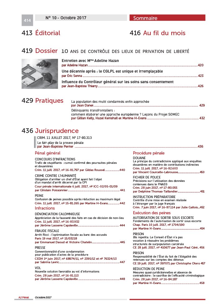 Entretien avec Mme Adeline Hazan par Adeline Hazan . 420 Une décennie après : le CGLPL est unique et irremplaçable par Éric Senna . 423 Influence du Contrôleur général sur les soins sans consentement par Jean- Baptiste Thierry . 426 419 Dossier 10 ANS DE CONTRÔLE DES LIEUX DE PRIVATION DE LIBERTÉ 429 Pratiques La population des multi condamnés enfin approchée par Jean Danet . 429 Délinquants transfrontaliers : comment élaborer une approche européenne ? Leçons du Projet SOMEC par Gillian Kelly, Hazel Kemshall et Martine H- Evans . 432 436 Jurisprudence CRIM. 11 JUILLET 2017, N° 17- 80.313 Le fair- play de la preuve pénale par Jean- Baptiste Perrier . 436 Pénal général CONCOURS D’INFRACTIONS Trafic de stupéfiants : cumul confirmé des poursuites pénales et douanières Crim. 11 juill. 2017, n º 16- 81.797 par Gildas Roussel . 440 CRIME CONTRE L’HUMANITÉ Obligation d’arrêter un chef d’État ayant fait l’objet d’un mandat d’arrêt décerné par la CPI Cour pénale internationale 6 juill. 2017, n º ICC- 02/ 05- 01/ 09 par Ghislain Poissonnier . 441 PEINE Confusion de peines possible après réduction au maximum légal Crim. 11 juill. 2017, n º 15- 81.265 par Martine H- Evans . 442 Infractions DÉNONCIATION CALOMNIEUSE Appréciation de la fausseté des faits en cas de décision de non- lieu Crim. 11 juill. 2017, n º 16- 83.932 par Jérôme Lasserre Capdeville . 444 FRAUDE FISCALE Arrêt Ricci : l’optimisation fiscale au banc des accusés Paris 19 mai 2017, n º 15/ 03218 par Emmanuel Daoud et Victoire Chatelin . 445 PRESSE Conventionnalité d’une condamnation pour publication d’actes de la procédure CEDH 1er juin 2017, n º 68974/ 11, n º 2395/ 12 et n º 76324/ 13 par Sabrina Lavric . 447 VOL Nouvelle solution favorable au vol d’informations Crim. 28 juin 2017, n º 16- 81.113 par Jérôme Lasserre Capdeville . 448 Procédure pénale DOUANE Le principe du contradictoire appliqué aux enquêtes douanières en matière de contributions indirectes Crim. 11 juill. 2017, n º 16- 82.603 par Vincent Courcelle- Labrousse . 450 FICHIER DE POLICE Précisions sur l’utilisation des données contenues dans le FNAEG Crim. 28 juin 2017, n º 17- 80.055 par Delphine Thomas- Taillandier . 451 INSTRUCTION PRÉPARATOIRE Contrôle d’une mise en examen réalisée à l’étranger par le juge français Crim. 7 juin 2017, n º 16- 87.114 par Julie Gallois . 452 Exécution des peines AUTORISATION DE SORTIR SOUS ESCORTE Fondements de l’autorisation de sortir sous escorte Chap. Paris 10 juill. 2017, n º 1704/ 190 par Martine H- Evans . 454 PRISON Bis repetita . Le Conseil d’État n’a pas vocation à résoudre les problèmes structurels de surpopulation carcérale CE 28 juill. 2017, n º 410677 par Jean- Paul Céré .. 456 PRISON Responsabilité de l’État du fait de l’illégalité des retenues sur les comptes des détenus CE 19 juill. 2017, n º 397071 par Christophe Otero 457 RÉDUCTION DE PEINE Mesures quasi- juridictionnelles et absence de contradictoire : le sacrifice de l’efficacité criminologique Crim. 28 juin 2017, n º 16- 84.187 par Martine H- Evans . 458
