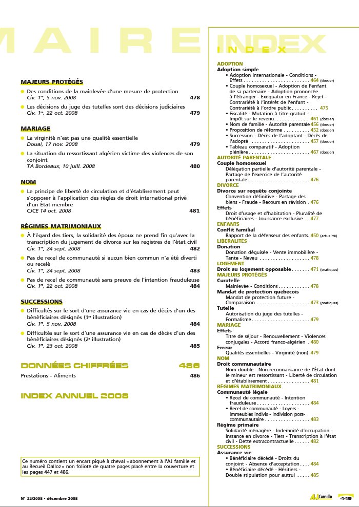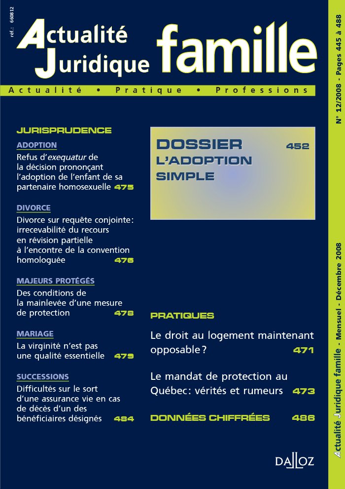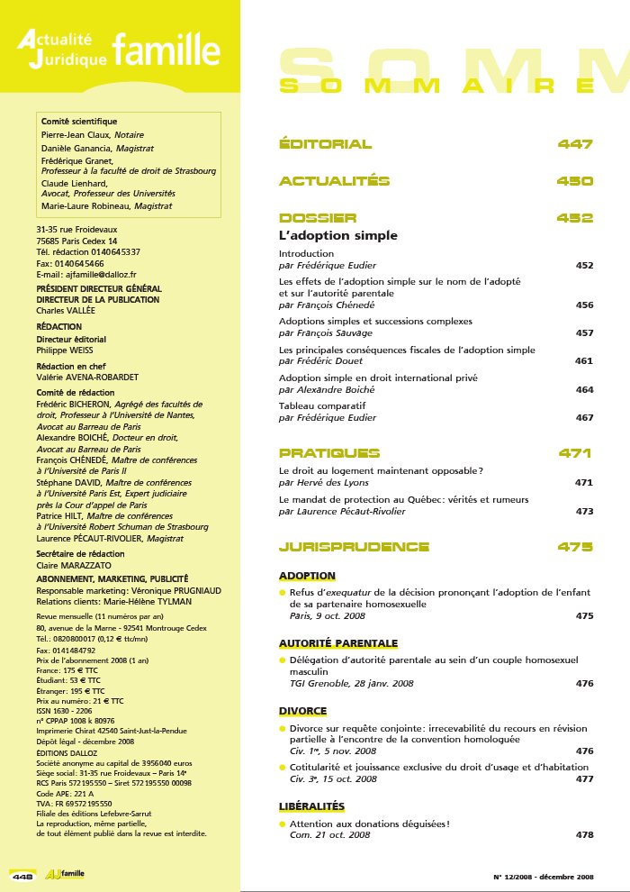 ÉDITORIAL 447 ACTUALITÉS 450 DOSSIER 452 L’adoption simple Introduction par Frédérique Eudier 452 Les effets de l’adoption simple sur le nom de l’adopté et sur l’autorité parentale par François Chénedé 456 Adoptions simples et successions complexes par François Sauvage 457 Les principales conséquences fiscales de l’adoption simple par Frédéric Douet 461 Adoption simple en droit international privé par Alexandre Boiché 464 Tableau comparatif par Frédérique Eudier 467 PRATIQUES 471 Le droit au logement maintenant opposable? par Hervé des Lyons 471 Le mandat de protection au Québec: vérités et rumeurs par Laurence Pécaut- Rivolier 473 JURISPRUDENCE 475 ADOPTION . Refus d’ exequatur de la décision prononçant l’adoption de l’enfant de sa partenaire homosexuelle Paris, 9 oct. 2008 475 AUTORITÉ PARENTALE . Délégation d’autorité parentale au sein d’un couple homosexuel masculin TGI Grenoble, 28 janv. 2008 476 DIVORCE . Divorce sur requête conjointe: irrecevabilité du recours en révision partielle à l’encontre de la convention homologuée Civ. 1re, 5 nov. 2008 476 . Cotitularité et jouissance exclusive du droit d’usage et d’habitation Civ. 3e, 15 oct. 2008 477 LIBÉRALITÉS . Attention aux donations déguisées! Com. 21 oct. 2008 478 M A I R E INDEX I N D E X MAJEURS PROTÉGÉS . Des conditions de la mainlevée d’une mesure de protection Civ. 1re, 5 nov. 2008 478 . Les décisions du juge des tutelles sont des décisions judiciaires Civ. 1re, 22 oct. 2008 479 MARIAGE . La virginité n’est pas une qualité essentielle Douai, 17 nov. 2008 479 . La situation du ressortissant algérien victime des violences de son conjoint TA Bordeaux, 10 juill. 2008 480 NOM . Le principe de liberté de circulation et d’établissement peut s’opposer à l’application des règles de droit international privé d’un État membre CJCE 14 oct. 2008 481 RÉGIMES MATRIMONIAUX . À l’égard des tiers, la solidarité des époux ne prend fin qu’avec la transcription du jugement de divorce sur les registres de l’état civil Civ. 1re, 24 sept. 2008 482 . Pas de recel de communauté si aucun bien commun n’a été diverti ou recelé Civ. 1re, 24 sept. 2008 483 . Pas de recel de communauté sans preuve de l’intention frauduleuse Civ. 1re, 22 oct. 2008 484 SUCCESSIONS . Difficultés sur le sort d’une assurance vie en cas de décès d’un des bénéficiaires désignés ( 1re illustration) Civ. 1re, 5 nov. 2008 484 . Difficultés sur le sort d’une assurance vie en cas de décès d’un des bénéficiaires désignés ( 2e illustration) Civ. 1re, 23 oct. 2008 485 DONNÉES CHIFFRÉES 486 Prestations - Aliments 486 INDEX ANNUEL 2008 ADOPTION Adoption simple • Adoption internationale - Conditions - Effets