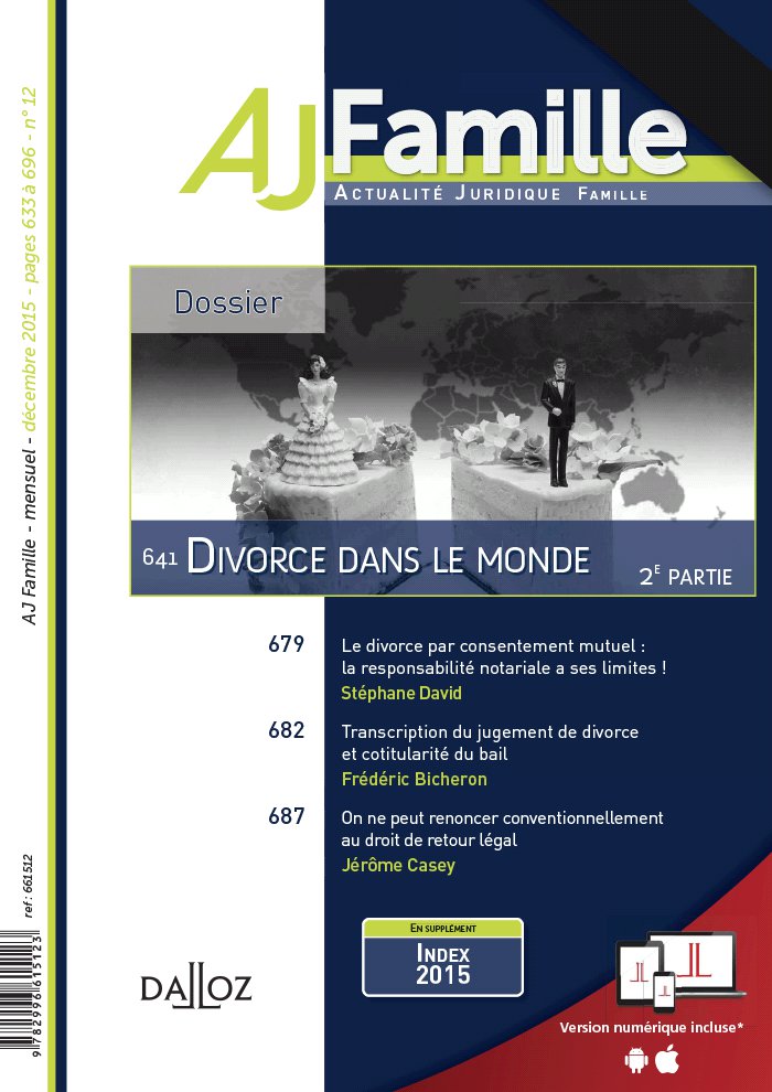 669 669 PARTIE) 672 Jurisprudence ADOPTION Refus de consentir à l’adoption d’un pupille de l’État : quel recours pour le candidat à l’adoption ? Toulouse, 7 juill. 2015, obs. P. Salvage- Gerest . 672 ALIMENTS Solidarité familiale : par le code civil, mais rien que le code civil ! Civ. 1re, 4 nov. 2015, obs. N. Dissaux . 673 Conflit de compétences autour de la pension alimentaire CJUE 16 juill. 2015, obs. A. Boiché . 674 Contribution à l’entretien et à l’éducation des enfants : l’appréciation des ressources des parents se fait au jour où le juge statue Civ. 1re, 7 oct. 2015, obs. S. Thouret . 676 Créance d’aliments : une compensation à sens unique Civ. 1re, 7 oct. 2015, obs. S. Thouret . 677 Quid des revenus du concubin dans la fixation de l’obligation d’entretien ? Civ. 1re, 21 oct. 2015, obs. C. Siffrein- Blanc . 678 AUTORITÉ PARENTALE La juridiction qui ordonne le droit de visite transfrontière est seule compétente pour délivrer le certificat de l’article 41 du règlement « Bruxelles II bis » Civ. 1re, 4 nov. 2015, obs. A. Boiché . 678 DIVORCE Le divorce par consentement mutuel : la responsabilité notariale a ses limites ! Civ. 1re, 9 juill. 2015, obs. S. David . 679 La transcription du jugement de divorce ayant attribué le bail à l’un des époux entraîne la fin de la cotitularité du bail tant légale que conventionnelle Civ. 3e, 22 oct. 2015, obs. F. Bicheron . 682 Action en révocation des donations : une cruauté presque historique… Civ. 1re, 4 nov. 2015, obs. J. Casey . 683 INDIVISION Une liquidation d’astreinte est un acte conservatoire que l’indivisaire peut accomplir seul Civ. 1re, 23 sept. 2015, obs. J. Casey . 684 LIBÉRALITÉS Évaluation de parts sociales et appréciation de l’existence d’une donation déguisée Civ. 1re, 7 oct. 2015, obs. N. Levillain . 684 Intention libérale et donation : entre appréciation souveraine et contrôle normatif Civ. 1re, 21 oct. 2015 ( 2 arrêts), obs. J. Casey . 686 On ne peut renoncer conventionnellement au droit de retour légal Civ. 1re, 21 oct. 2015, obs. J. Casey . 687 MAJEURS PROTÉGÉS Le majeur protégé a droit au respect du principe de la contradiction : nouveau rappel Civ. 1re, 18 nov. 2015, obs. V. A.- R