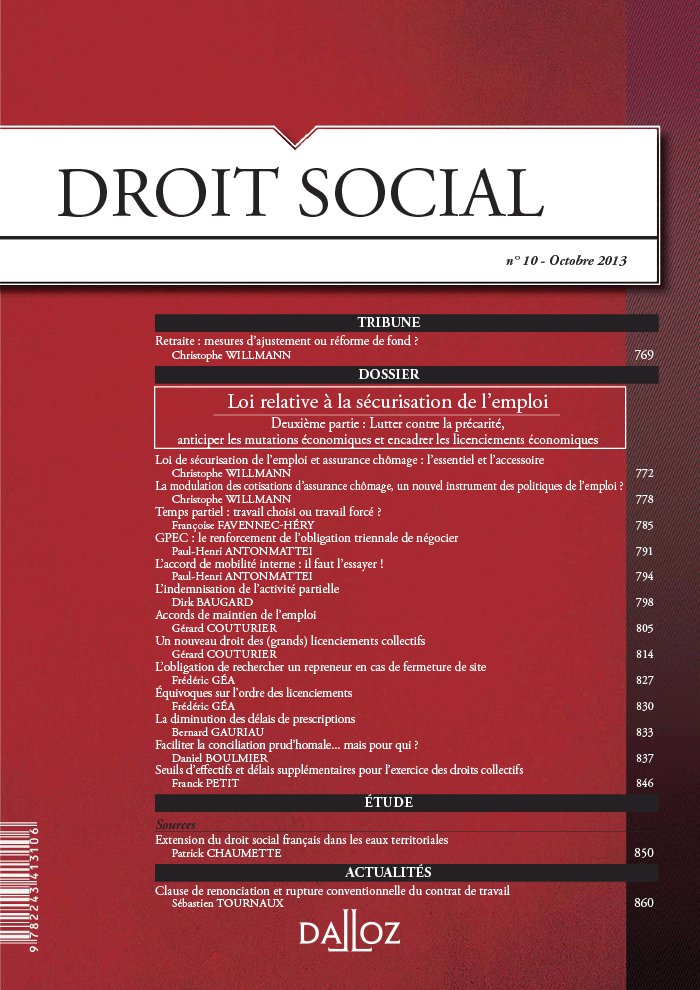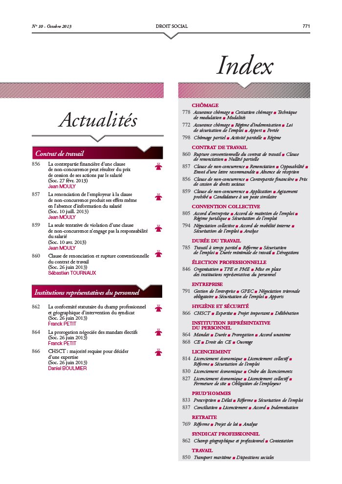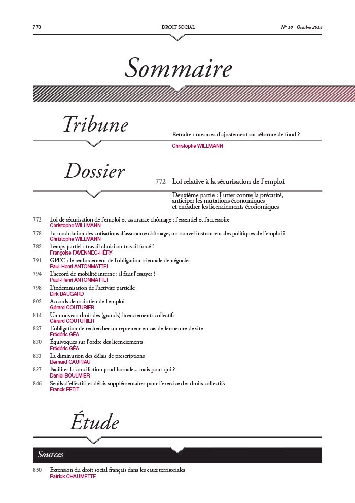 N ° 10 - Octobre 2013 DROIT SOCIAL 770 Tribune Retraite : mesures d’ajustement ou réforme de fond ? Christophe WILLMANN Sommaire Étude 850 Extension du droit social français dans les eaux territoriales Patrick CHAUMETTE Sources 772 Loi relative à la sécurisation de l’emploi Deuxième partie : Lutter contre la précarité, anticiper les mutations économiques et encadrer les licenciements économiques Dossier 772 Loi de sécurisation de l’emploi et assurance chômage : l’essentiel et l’accessoire Christophe WILLMANN 778 La modulation des cotisations d’assurance chômage, un nouvel instrument des politiques de l’emploi ? Christophe WILLMANN 785 Temps partiel : travail choisi ou travail forcé ? Françoise FAVENNEC- HÉRY 791 GPEC : le renforcement de l’obligation triennale de négocier Paul- Henri ANTONMATTEI 794 L’accord de mobilité interne : il faut l’essayer ! Paul- Henri ANTONMATTEI 798 L’indemnisation de l’activité partielle Dirk BAUGARD 805 Accords de maintien de l’emploi Gérard COUTURIER 814 Un nouveau droit des ( grands) licenciements collectifs Gérard COUTURIER 827 L’obligation de rechercher un repreneur en cas de fermeture de site Frédéric GÉA 830 Équivoques sur l’ordre des licenciements Frédéric GÉA 833 La diminution des délais de prescriptions Bernard GAURIAU 837 Faciliter la conciliation prud’homale. mais pour qui ? Daniel BOULMIER 846 Seuils d’effectifs et délais supplémentaires pour l’exercice des droits collectifs Franck PETIT N ° 10 - Octobre 2013 DROIT SOCIAL 771 Actualités 856 La contrepartie financière d’une clause de non- concurrence peut résulter du prix de cession de ses actions par le salarié ( Soc. 27 févr. 2013) Jean MOULY 857 La renonciation de l’employeur à la clause de non- concurrence produit ses effets même en l’absence d’information du salarié ( Soc. 10 juill. 2013) Jean MOULY 859 La seule tentative de violation d’une clause de non- concurrence n’engage pas la responsabilité du salarié ( Soc. 10 avr. 2013) Jean MOULY 860 Clause de renonciation et rupture conventionnelle du contrat de travail ( Soc. 26 juin 2013) Sébastien TOURNAUX 862 La conformité statutaire du champ professionnel et géographique d’intervention du syndicat ( Soc. 26 juin 2013) Franck PETIT 864 La prorogation négociée des mandats électifs ( Soc. 26 juin 2013) Franck PETIT 866 CHSCT : majorité requise pour décider d’une expertise ( Soc. 26 juin 2013) Daniel BOULMIER Contrat de travail Index CHÔMAGE 778 Assurance chômage ¦ Cotisation chômage ¦ Technique de modulation ¦ Modalités 772 Assurance chômage ¦ Régime d’indemnisation ¦ Loi de sécurisation de l’emploi ¦ Apport ¦ Portée 798 Chômage partiel ¦ Activité partielle ¦ Régime CONTRAT DE TRAVAIL 860 Rupture conventionnelle du contrat de travail ¦ Clause de renonciation ¦ Nullité partielle 857 Clause de non- concurrence ¦ Renonciation ¦ Opposabilité ¦ Envoi d’une lettre recommandée ¦ Absence de réception 856 Clause de non- concurrence ¦ Contrepartie financière ¦ Prix de cession de droits sociaux 859 Clause de non- concurrence ¦ Application ¦ Agissement prohibé ¦ Candidature à un poste similaire CONVENTION COLLECTIVE 805 Accord d’entreprise ¦ Accord de maintien de l’emploi ¦ Régime juridique ¦ Sécurisation de l’emploi 794 Négociation collective ¦ Accord de mobilité interne ¦ Sécurisation de l’emploi ¦ Analyse DURÉE DU TRAVAIL 785 Travail à temps partiel ¦ Réforme ¦ Sécurisation de l’emploi ¦ Durée minimale de travail ¦ Dérogations ÉLECTION PROFESSIONNELLE 846 Organisation ¦ TPE et PME ¦ Mise en place des institutions représentatives du personnel ENTREPRISE 791 Gestion de l’entreprise ¦ GPEC ¦ Négociation triennale obligatoire ¦ Sécurisation de l’emploi ¦ Apports HYGIÈNE ET SÉCURITÉ 866 CHSCT ¦ Expertise ¦ Projet important ¦ Délibération INSTITUTION REPRÉSENTATIVE DU PERSONNEL 864 Mandat ¦ Durée ¦ Prorogation ¦ Accord unanime 868 CE ¦ Droit des CE ¦ Ouvrage LICENCIEMENT 814 Licenciement économique ¦ Licenciement collectif ¦ Réforme ¦ Sécurisation de l’emploi 830 Licenciement économique ¦ Ordre des licenciements 827 Licenciement économique ¦ Licenciement collectif ¦ Fermeture de site ¦ Obligation de l’employeur PRUD’HOMMES 833 Prescription ¦ Délai ¦ Réforme ¦ Sécurisation de l’emploi 837 Conciliation ¦ Licenciement ¦ Accord ¦ Indemnisation RETRAITE 769 Réforme ¦ Projet de loi ¦ Analyse SYNDICAT PROFESSIONNEL 862 Champ géographique et professionnel ¦ Contestation TRAVAIL 850 Transport maritime ¦ Dispositions sociales Institutions représentatives du personnel