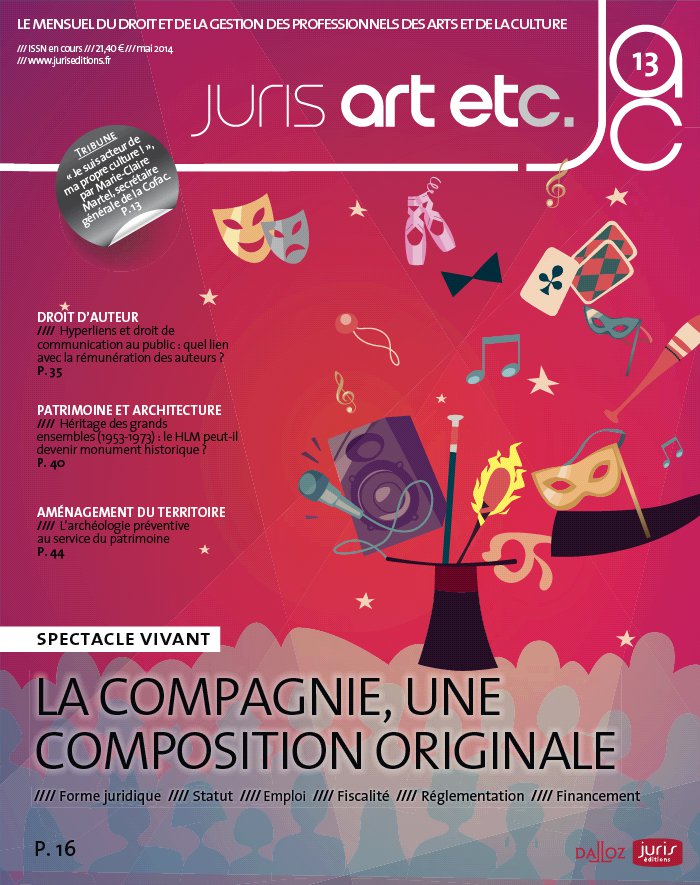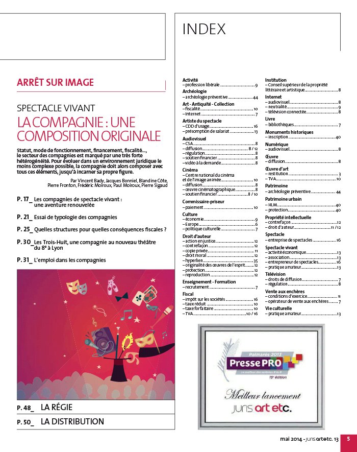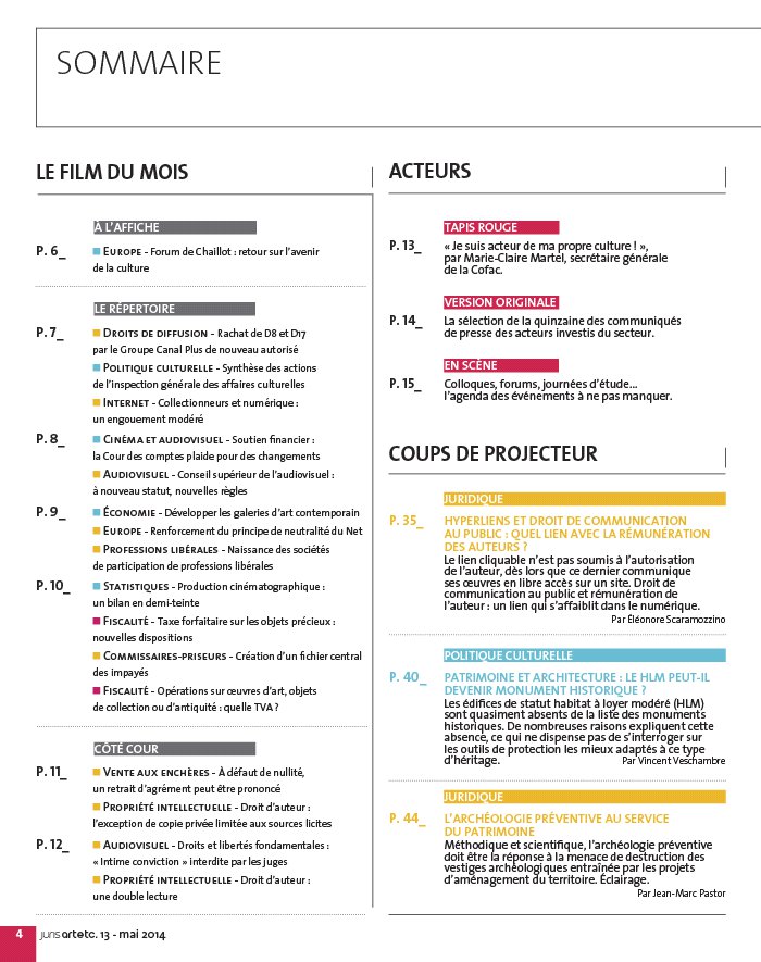 À L’AFFICHE P. 6_ Europe - Forum de Chaillot : retour sur l’avenir de la culture LE RÉPERTOIRE P. 7_ Droits de diffusion - Rachat de D8 et D17 par le Groupe Canal Plus de nouveau autorisé Politique culturelle - Synthèse des actions de l’inspection générale des affaires culturelles Internet - Collectionneurs et numérique : un engouement modéré P. 8_ Cinéma et audiovisuel - Soutien financier : la Cour des comptes plaide pour des changements Audiovisuel - Conseil supérieur de l’audiovisuel : à nouveau statut, nouvelles règles P. 9_ Économie - Développer les galeries d’art contemporain Europe - Renforcement du principe de neutralité du Net Professions libérales - Naissance des sociétés de participation de professions libérales P. 10_ Statistiques - Production cinématographique : un bilan en demi- teinte Fiscalité - Taxe forfaitaire sur les objets précieux : nouvelles dispositions Commissaires- priseurs - Création d’un fichier central des impayés Fiscalité - Opérations sur oeuvres d’art, objets de collection ou d’antiquité : quelle TVA ? CÔTÉ COUR P. 11_ Vente aux enchères - À défaut de nullité, un retrait d’agrément peut être prononcé Propriété intellectuelle - Droit d’auteur : l’exception de copie privée limitée aux sources licites P. 12_ Audiovisuel - Droits et libertés fondamentales : « Intime conviction » interdite par les juges Propriété intellectuelle - Droit d’auteur : une double lecture COUPS DE PROJECTEUR JURIDIQUE P. 35_ HYPERLIENS ET DROIT DE COMMUNICATION AU PUBLIC : QUEL LIEN AVEC LA RÉMUNÉRATION DES AUTEURS ? Le lien cliquable n’est pas soumis à l’autorisation de l’auteur, dès lors que ce dernier communique ses oeuvres en libre accès sur un site. Droit de communication au public et rémunération de l’auteur : un lien qui s’affaiblit dans le numérique. Par Éléonore Scaramozzino POLITIQUE CULTURELLE P. 40_ PATRIMOINE ET ARCHITECTURE : LE HLM PEUT- IL DEVENIR MONUMENT HISTORIQUE ? Les édifices de statut habitat à loyer modéré ( HLM) sont quasiment absents de la liste des monuments historiques. De nombreuses raisons expliquent cette absence, ce qui ne dispense pas de s’interroger sur les outils de protection les mieux adaptés à ce type d’héritage. Par Vincent Veschambre JURIDIQUE P. 44_ L’ARCHÉOLOGIE PRÉVENTIVE AU SERVICE DU PATRIMOINE Méthodique et scientifique, l’archéologie préventive doit être la réponse à la menace de destruction des vestiges archéologiques entraînée par les projets d’aménagement du territoire. Éclairage. Par Jean- Marc Pastor TAPIS ROUGE P. 13_ « Je suis acteur de ma propre culture ! » , par Marie- Claire Martel, secrétaire générale de la Cofac. VERSION ORIGINALE P. 14_ La sélection de la quinzaine des communiqués de presse des acteurs investis du secteur. EN SCÈNE P. 15_ Colloques, forums, journées d’étude. l’agenda des événements à ne pas manquer. P. 50_ LA DISTRIBUTION ARRÊT SUR IMAGE SPECTACLE VIVANT LA COMPAGNIE : UNE COMPOSITION ORIGINALE Statut, mode de fonctionnement, financement, fiscalité…, le secteur des compagnies est marqué par une très forte hétérogénéité. Pour évoluer dans un environnement juridique le moins complexe possible, la compagnie doit alors composer avec tous ces éléments, jusqu’à incarner sa propre figure. Par Vincent Bady, Jacques Bonniel, Blandine Côte, Pierre Fronton, Frédéric Moiroux, Paul Moiroux, Pierre Sigaud P. 17_ Les compagnies de spectacle vivant : une aventure renouvelée P. 21_ Essai de typologie des compagnies P. 25_ Quelles structures pour quelles conséquences fiscales ? P. 30_ Les Trois- Huit, une compagnie au nouveau théâtre du 8e à Lyon P. 31_ L’emploi dans les compagnies P. 48_ LA RÉGIE Activité – profession libérale . 9 Archéologie – archéologie préventive . 44 Art - Antiquité - Collection – fiscalité . 10 – Internet . 7 Artiste du spectacle – CDD d’usage . 16 – présomption de salariat . 13 Audiovisuel – CSA . 8 – diffusion . 8 / 12 – régulation . 8 – soutien financier . 8 – vidéo à la demande . 8 Cinéma – Centre national du cinéma et de l’image animée . 10 – diffusion . 8 – oeuvre cinématographique . 8 – soutien financier . 8 / 10 Commissaire- priseur – paiement . 10 Culture – économie . 9 – Europe . 6 – politique culturelle . 7 Droit d’auteur – action en justice . 12 – contrefaçon . 12 – copie privée . 11 – droit moral . 12 – hyperlien . 35 – originalité des oeuvres de l’esprit . 12 – protection . 12 – reproduction . 12 Enseignement - Formation – recrutement . 7 Fiscal – impôt sur les sociétés . 16 – taux réduit . 10 – taxe forfaitaire . 10 – TVA . 10 / 16 Institution – Conseil supérieur de la propriété littéraire et artistique . 8 Internet – audiovisuel. 8 – neutralité . 9 – télévision connectée . 8 Livre – bibliothèques . 7 Monuments historiques – inscription . 40 Numérique – audiovisuel. 8 OEuvre – diffusion . 8 OEuvre d’art – restitution . 3 – TVA . 10 Patrimoine – archéologie préventive . 44 Patrimoine urbain – HLM . 40 – protection . 40 Propriété intellectuelle – contrefaçon . 12 – droit d’auteur . 11 / 12 Spectacle – entreprise de spectacles . 16 Spectacle vivant – activité économique . 13 – association . 13 – entrepreneur de spectacles. 16 – pratique amateur . 13 Télévision – droits de diffusion . 7 – régulation . 8 Vente aux enchères – conditions d’exercice . 11 – opérateur de vente aux enchères . 7 Vie culturelle – pratique amateur . 13