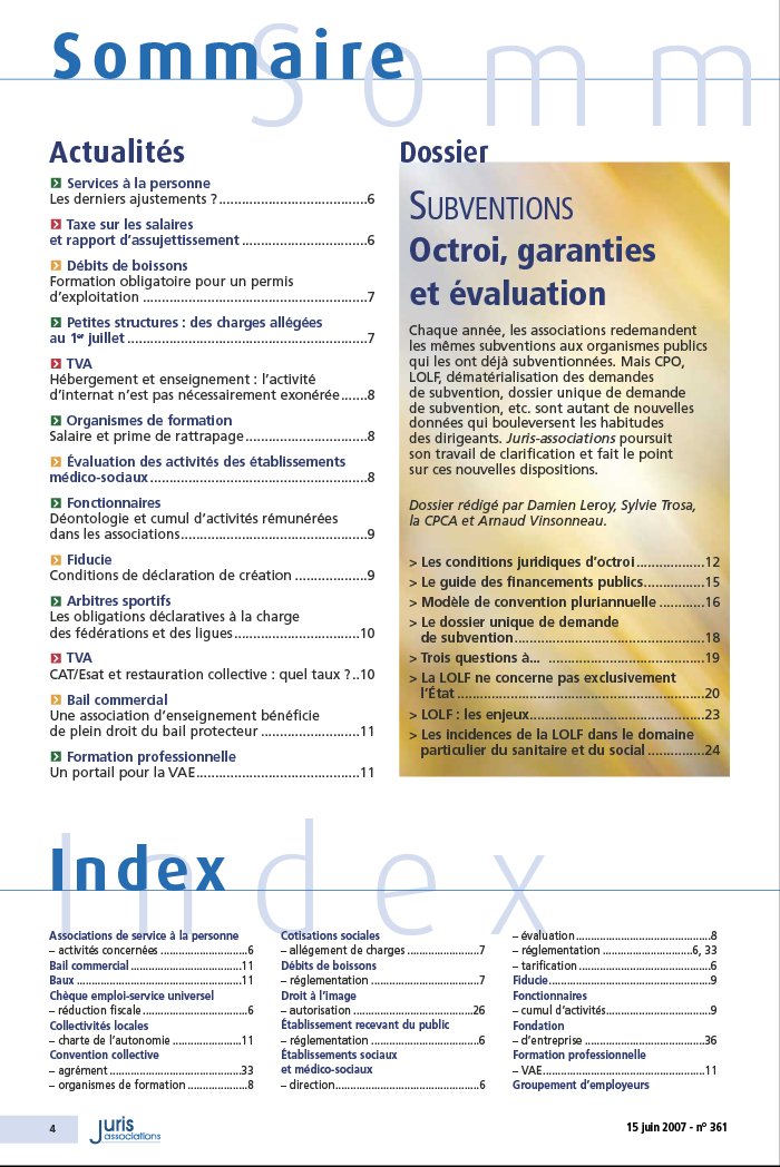 I n d e x Index 4 15 juin 2007 - n ° 361 Associations de service à la personne – activités concernées . 6 Bail commercial . 11 Baux . 11 Chèque emploi- service universel – réduction fiscale . 6 Collectivités locales – charte de l’autonomie . 11 Convention collective – agrément . 33 – organismes de formation . 8 Cotisations sociales – allégement de charges . 7 Débits de boissons – réglementation . 7 Droit à l’image – autorisation . 26 Établissement recevant du public – réglementation . 6 Établissements sociaux et médico- sociaux – direction. 6 – évaluation. 8 – réglementation . 6, 33 – tarification . 6 Fiducie. 9 Fonctionnaires – cumul d’activités. 9 Fondation – d’entreprise . 36 Formation professionnelle – VAE. 11 Groupement d’employeurs Actualités Services à la personne Les derniers ajustements ? . 6 Taxe sur les salaires et rapport d’assujettissement . 6 Débits de boissons Formation obligatoire pour un permis d’exploitation . 7 Petites structures : des charges allégées au 1er juillet . 7 TVA Hébergement et enseignement : l’activité d’internat n’est pas nécessairement exonérée. 8 Organismes de formation Salaire et prime de rattrapage . 8 Évaluation des activités des établissements médico- sociaux. 8 Fonctionnaires Déontologie et cumul d’activités rémunérées dans les associations. 9 Fiducie Conditions de déclaration de création . 9 Arbitres sportifs Les obligations déclaratives à la charge des fédérations et des ligues . 10 TVA CAT/ Esat et restauration collective : quel taux ?.. 10 Bail commercial Une association d’enseignement bénéficie de plein droit du bail protecteur . 11 Formation professionnelle Un portail pour la VAE. 11 S o m m Sommaire Dossier SUBVENTIONS Octroi, garanties et évaluation Chaque année, les associations redemandent les mêmes subventions aux organismes publics qui les ont déjà subventionnées. Mais CPO, LOLF, dématérialisation des demandes de subvention, dossier unique de demande de subvention, etc. sont autant de nouvelles données qui bouleversent les habitudes des dirigeants. Juris- associations poursuit son travail de clarification et fait le point sur ces nouvelles dispositions. Dossier rédigé par Damien Leroy, Sylvie Trosa, la CPCA et Arnaud Vinsonneau. > Les conditions juridiques d’octroi . 12 > Le guide des financements publics. 15 > Modèle de convention pluriannuelle . 16 > Le dossier unique de demande de subvention. 18 > Trois questions à