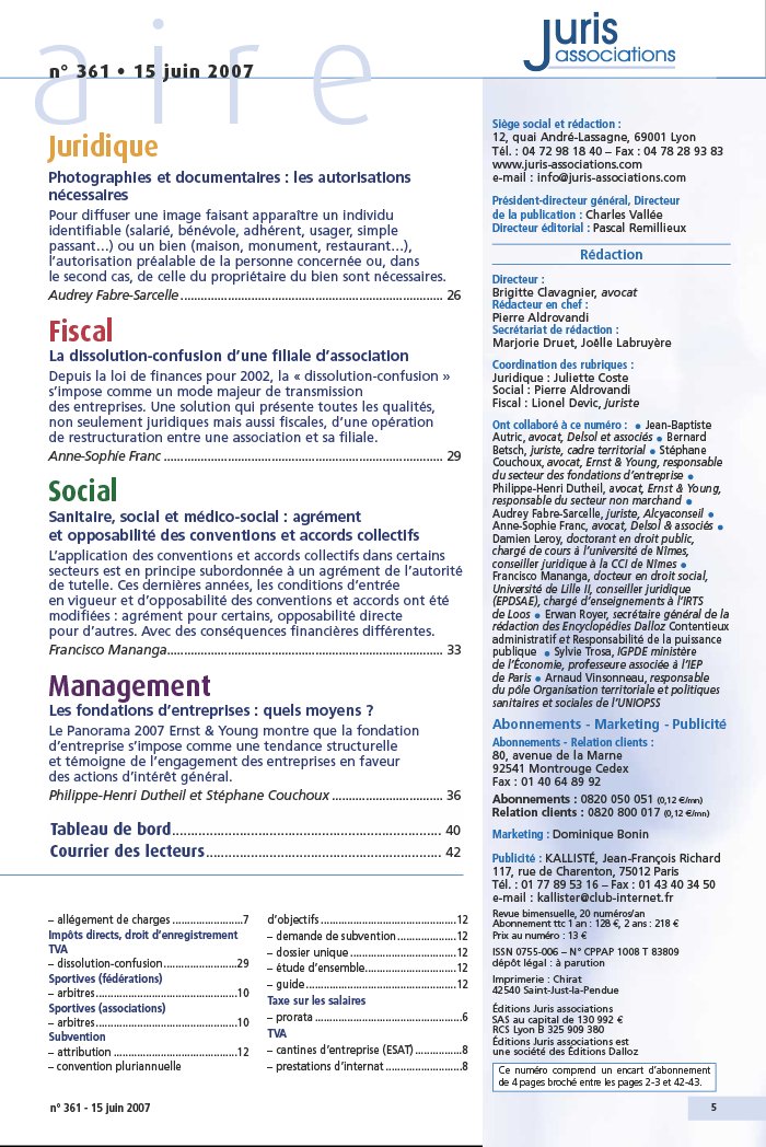19 > La LOLF ne concerne pas exclusivement l’État . 20 > LOLF : les enjeux. 23 > Les incidences de la LOLF dans le domaine particulier du sanitaire et du social . 24 n ° 361 - 15 juin 2007 – allégement de charges . 7 Impôts directs, droit d’enregistrement TVA – dissolution- confusion. 29 Sportives ( fédérations) – arbitres. 10 Sportives ( associations) – arbitres. 10 Subvention – attribution . 12 – convention pluriannuelle d’objectifs . 12 – demande de subvention. 12 – dossier unique . 12 – étude d’ensemble. 12 – guide . 12 Taxe sur les salaires – prorata . 6 TVA – cantines d’entreprise ( ESAT) . 8 – prestations d’internat . 8 Siège social et rédaction : 12, quai André- Lassagne, 69001 Lyon Tél. : 04 72 98 18 40 – Fax : 04 78 28 93 83 www. juris- associations. com e- mail : info@ juris- associations. com Président- directeur général, Directeur de la publication : Charles Vallée Directeur éditorial : Pascal Remillieux Rédaction Directeur : Brigitte Clavagnier, avocat Rédacteur en chef : Pierre Aldrovandi Secrétariat de rédaction : Marjorie Druet, Joëlle Labruyère Coordination des rubriques : Juridique : Juliette Coste Social : Pierre Aldrovandi Fiscal : Lionel Devic, juriste Ont collaboré à ce numéro : Jean- Baptiste Autric, avocat, Delsol et associés Bernard Betsch, juriste, cadre territorial Stéphane Couchoux, avocat, Ernst & Young, responsable du secteur des fondations d’entreprise Philippe- Henri Dutheil, avocat, Ernst & Young, responsable du secteur non marchand Audrey Fabre- Sarcelle, juriste, Alcyaconseil Anne- Sophie Franc, avocat, Delsol & associés Damien Leroy, doctorant en droit public, chargé de cours à l’université de Nîmes, conseiller juridique à la CCI de Nîmes Francisco Mananga, docteur en droit social, Université de Lille II, conseiller juridique ( EPDSAE), chargé d’enseignements à l’IRTS de Loos Erwan Royer, secrétaire général de la rédaction des Encyclopédies Dalloz Contentieux administratif et Responsabilité de la puissance publique Sylvie Trosa, IGPDE ministère de l’Économie, professeure associée à l’IEP de Paris Arnaud Vinsonneau, responsable du pôle Organisation territoriale et politiques sanitaires et sociales de l’UNIOPSS Abonnements - Marketing - Publicité Abonnements - Relation clients : 80, avenue de la Marne 92541 Montrouge Cedex Fax : 01 40 64 89 92 Abonnements : 0820 050 051 ( 0,12 e / mn) Relation clients : 0820 800 017 ( 0,12 e / mn) Marketing : Dominique Bonin Publicité : KALLISTÉ, Jean- François Richard 117, rue de Charenton, 75012 Paris Tél. : 01 77 89 53 16 – Fax : 01 43 40 34 50 e- mail : kallister@ club- internet. fr Revue bimensuelle, 20 numéros/ an Abonnement ttc 1 an : 128 €, 2 ans : 218 € Prix au numéro : 13 € ISSN 0755- 006 – N ° CPPAP 1008 T 83809 dépôt légal : à parution Imprimerie : Chirat 42540 Saint- Just- la- Pendue Éditions Juris associations SAS au capital de 130 992 € RCS Lyon B 325 909 380 Éditions Juris associations est une société des Éditions Dalloz 5 Juridique Photographies et documentaires : les autorisations nécessaires Pour diffuser une image faisant apparaître un individu identifiable ( salarié, bénévole, adhérent, usager, simple passant…) ou un bien ( maison, monument, restaurant…), l’autorisation préalable de la personne concernée ou, dans le second cas, de celle du propriétaire du bien sont nécessaires. Audrey Fabre- Sarcelle . 26 Fiscal La dissolution- confusion d’une filiale d’association Depuis la loi de finances pour 2002, la « dissolution- confusion » s’impose comme un mode majeur de transmission des entreprises. Une solution qui présente toutes les qualités, non seulement juridiques mais aussi fiscales, d’une opération de restructuration entre une association et sa filiale. Anne- Sophie Franc . 29 Social Sanitaire, social et médico- social : agrément et opposabilité des conventions et accords collectifs L’application des conventions et accords collectifs dans certains secteurs est en principe subordonnée à un agrément de l’autorité de tutelle. Ces dernières années, les conditions d’entrée en vigueur et d’opposabilité des conventions et accords ont été modifiées : agrément pour certains, opposabilité directe pour d’autres. Avec des conséquences financières différentes. Francisco Mananga. 33 Management Les fondations d’entreprises : quels moyens ? Le Panorama 2007 Ernst & Young montre que la fondation d’entreprise s’impose comme une tendance structurelle et témoigne de l’engagement des entreprises en faveur des actions d’intérêt général. Philippe- Henri Dutheil et Stéphane Couchoux . 36 Tableau de bord. 40 Courrier des lecteurs. 42 a i r e n ° 361 • 15 juin 2007 Ce numéro comprend un encart d’abonnement de 4 pages broché entre les pages 2- 3 et 42- 43.