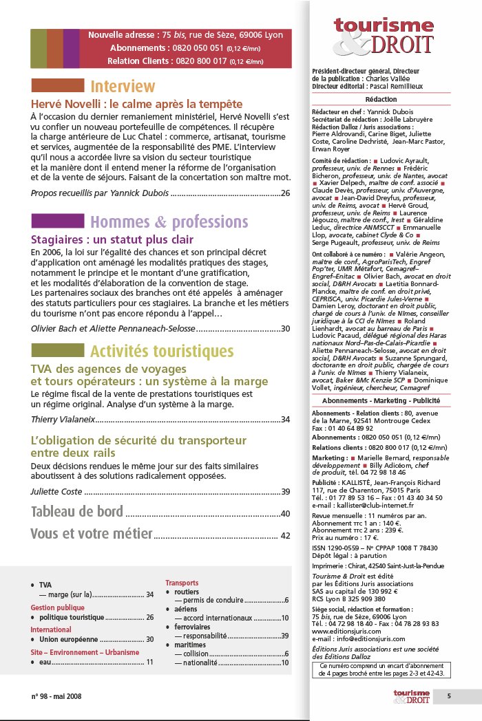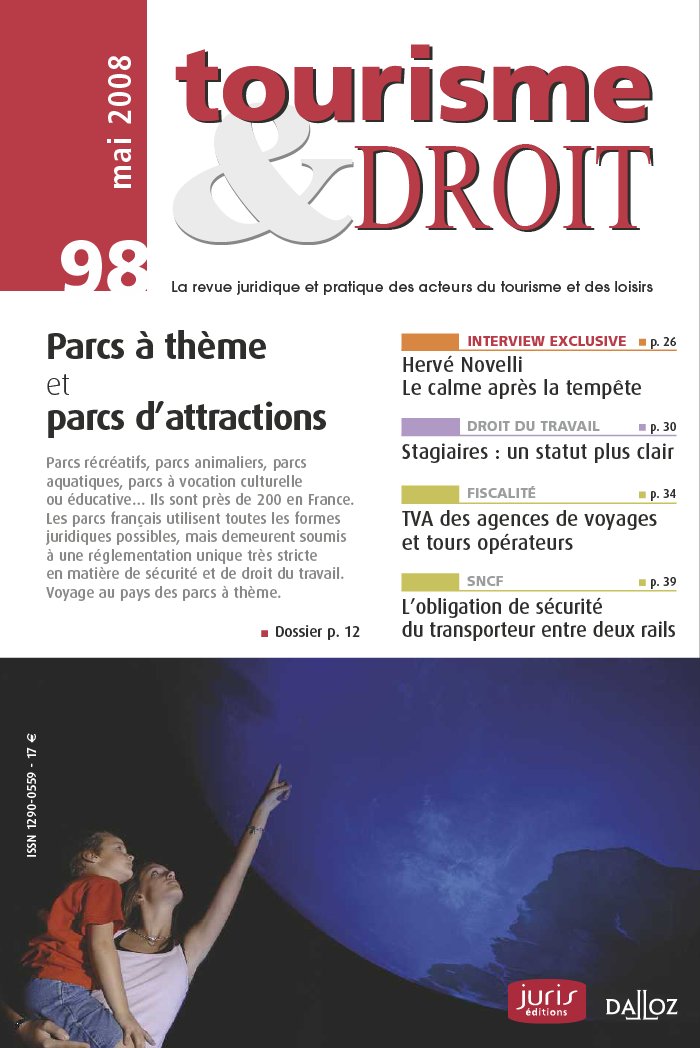 10 Travailleurs handicapés Convention État- Agefih 2008- 2010. 11 Zone franche : déclaration reportée . 11 Une circulaire sur la définition des eaux closes. 11 Dossier Parcs à thème & parcs d’attractions n ° 98 - mai 2008 l TVA — marge ( sur la). 34 Gestion publique l politique touristique . 26 International l Union européenne . 30 Site – Environnement – Urbanisme l eau. 11 Transports l routiers — permis de conduire. 6 l aériens — accord internationaux . 10 l ferroviaires — responsabilité . 39 l maritimes — collision. 6 — nationalité . 10 Interview Hervé Novelli : le calme après la tempête À l’occasion du dernier remaniement ministériel, Hervé Novelli s’est vu confier un nouveau portefeuille de compétences. Il récupère la charge antérieure de Luc Chatel : commerce, artisanat, tourisme et services, augmentée de la responsabilité des PME. L’interview qu’il nous a accordée livre sa vision du secteur touristique et la manière dont il entend mener la réforme de l’organisation et de la vente de séjours. Faisant de la concertation son maître mot. Propos recueillis par Yannick Dubois . 26 Hommes & professions Stagiaires : un statut plus clair En 2006, la loi sur l’égalité des chances et son principal décret d’application ont aménagé les modalités pratiques des stages, notamment le principe et le montant d’une gratification, et les modalités d’élaboration de la convention de stage. Les partenaires sociaux des branches ont été appelés à aménager des statuts particuliers pour ces stagiaires. La branche et les métiers du tourisme n’ont pas encore répondu à l’appel… Olivier Bach et Aliette Pennaneach- Selosse. 30 Activités touristiques TVA des agences de voyages et tours opérateurs : un système à la marge Le régime fiscal de la vente de prestations touristiques est un régime original. Analyse d’un système à la marge. Thierry Vialaneix. 34 L’obligation de sécurité du transporteur entre deux rails Deux décisions rendues le même jour sur des faits similaires aboutissent à des solutions radicalement opposées. Juliette Coste . 39 Tableau de bord . 40 Vous et votre métier. 42 && tourisme DROIT tourisme DROIT && tourisme DROIT tourisme DROIT Président- directeur général, Directeur de la publication : Charles Vallée Directeur éditorial : Pascal Remillieux Rédaction Rédacteur en chef : Yannick Dubois Secrétariat de rédaction : Joëlle Labruyère Rédaction Dalloz / Juris associations : Pierre Aldrovandi, Carine Biget, Juliette Coste, Caroline Dechristé, Jean- Marc Pastor, Erwan Royer Comité de rédaction : Ludovic Ayrault, professeur, univ. de Rennes Frédéric Bicheron, professeur, univ. de Nantes, avocat Xavier Delpech, maître de conf. associé Claude Devès, professeur, univ. d’Auvergne, avocat Jean- David Dreyfus, professeur, univ. de Reims, avocat Hervé Groud, professeur, univ. de Reims Laurence Jégouzo, maître de conf., Irest Géraldine Leduc, directrice ANMSCCT Emmanuelle Llop, avocate, cabinet Clyde & Co Serge Pugeault, professeur, univ. de Reims Ont collaboré à ce numéro : Valérie Angeon, maître de conf., AgroParisTech, Engref Pop’ter, UMR Métafort, Cemagref– Engref– Enitac Olivier Bach, avocat en droit social, D& RH Avocats Laetitia Bonnard- Plancke, maître de conf. en droit privé, CEPRISCA, univ. Picardie Jules- Verne Damien Leroy, doctorant en droit public, chargé de cours à l’univ. de Nîmes, conseiller juridique à la CCI de Nîmes Roland Lienhardt, avocat au barreau de Paris Ludovic Pacaud, délégué régional des Haras nationaux Nord– Pas- de- Calais– Picardie Aliette Pennaneach- Selosse, avocat en droit social, D& RH Avocats Suzanne Sprungard, doctorante en droit public, chargée de cours à l’univ. de Nîmes Thierry Vialaneix, avocat, Baker & Mc Kenzie SCP Dominique Vollet, ingénieur, chercheur, Cemagref Abonnements - Marketing - Publicité Abonnements - Relation clients : 80, avenue de la Marne, 92541 Montrouge Cedex Fax : 01 40 64 89 92 Abonnements : 0820 050 051 ( 0,12 e / mn) Relations clients : 0820 800 017 ( 0,12 e / mn) Marketing : Marielle Bernard, responsable développement Billy Adicéom, chef de produit, tél. 04 72 98 18 46 Publicité : KALLISTÉ, Jean- François Richard 117, rue de Charenton, 75015 Paris Tél. : 01 77 89 53 16 – Fax : 01 43 40 34 50 e- mail : kallister@ club- internet. fr Revue mensuelle : 11 numéros par an. Abonnement TTC 1 an : 140 €. Abonnement TTC 2 ans : 239 €. Prix au numéro : 17 €. ISSN 1290- 0559 – No CPPAP 1008 T 78430 Dépôt légal : à parution Imprimerie : Chirat, 42540 Saint- Just- la- Pendue Tourisme & Droitest édité par les Éditions Juris associations SAS au capital de 130 992 € RCS Lyon B 325 909 380 Siège social, rédaction et formation : 75 bis, rue de Sèze, 69006 Lyon Tél. : 04 72 98 18 40 - Fax : 04 78 28 93 83 www. editionsjuris. com e- mail : info@ editionsjuris. com Éditions Juris associations est une société des Éditions Dalloz Ce numéro comprend un encart d’abonnement de 4 pages broché entre les pages 2- 3 et 42- 43. 5 Nouvelle adresse : 75 bis, rue de Sèze, 69006 Lyon Abonnements : 0820 050 051 ( 0,12 €/ mn) Relation Clients : 0820 800 017 ( 0,12 €/ mn)