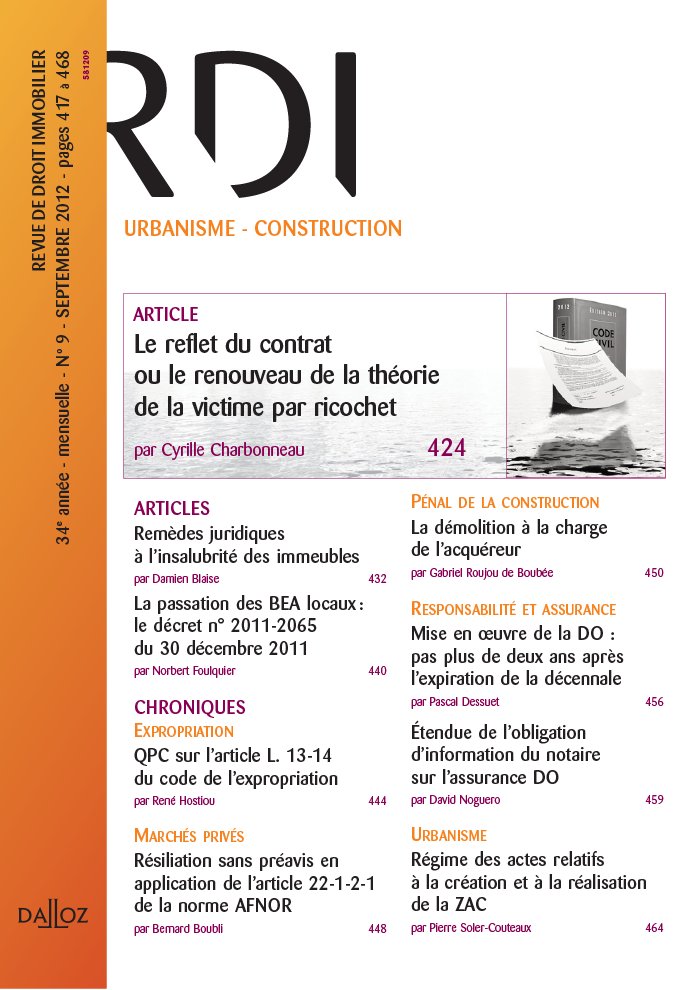 SOMMAIRE URBANISME - CONSTRUCTION ACTUALITÉS . Expropriation en vue de la construction QPC au sujet de la constitutionnalité de l’article L. 13- 14 du code de l’expropria-tion. 444 Marchés de travaux privés et autres contrats Sur la responsabilité du maître d’oeuvre en cas d’absence d’ouvrage. 446 Les honoraires peuvent être majorés des intérêts de retard et accompagnés de dommages- intérêts distincts . 447 Le maître de l’ouvrage peut résilier le marché à forfait sans préavis. 448 Sur la réception tacite des travaux . 449 Pénal de la construction et de l’urbanisme La démolition par l’acquéreur. 450 Propriété des personnes publiques La quasi- expropriation des vestiges archéologiques immobiliers. 451 Responsabilité et assurance des constructeurs La non- déclaration de chantier en RC décennale : quelle sanction ? ( suite) . 455 DO: les limites de la sanction pour non-respect des délais. 456 DO: le formalisme de la déclaration de sinistre – lettre recommandée ou non ?. 458 La responsabilité du notaire et de l’agent immobilier au regard de l’information sur la souscription de l’assurance obligatoire de dommages- ouvrage. 459 La forme de la déclaration de sinistre – Catastrophes naturelles : télécopie et représentation. 461 Urbanisme La procédure de modification doit être lancée par une délibération du conseil municipal . 463 La décision approuvant le dossier de réa-lisation d’une ZAC est une simple mesure préparatoire – Sur l’articulation de l’acte de création, des décisions approuvant le dossier de réalisation et le programme des équipements publics avec la règle d’urbanisme. 464 L’écoulement du délai imparti à la CNAC n’est pas sanctionné par son dessaisisse-ment . 466 CHRONIQUES . TRIBUNE . No 9 - Septembre 2012 31- 35, rue Froidevaux, 75685 Paris Cedex 14 Tél. Rédaction : 01 40 64 12 74/ 12 68 Fax: 01 40 64 54 66 mail : m. lequellec@ dalloz. fr a. dos- santos@ dalloz. fr PRÉSIDENTE DIRECTRICE GÉNÉRALE, DIRECTRICE DE LA PUBLICATION Sylvie Faye RÉDACTION Directeur : Philippe Malinvaud, Professeur émérite de l’Université Panthéon- Assas ( Paris II) Secrétaire générale : Rozen Noguellou, Professeur de droit public à l’Université Paris- Est Créteil Rubriques Jean- Louis Bergel, Bernard Boubli, Stéphane Braconnier, Jean- Christophe Chaput, Benoît Delaunay, Laurent Fonbaustier, Norbert Foulquier, Elodie Gavin- Millan- Oosterlynck, Henri Heugas- Darraspen, René Hostiou, Yves Jégouzo, Emmanuel Kornprobst, Gilbert Leguay, François Magnin, Philippe Malinvaud, Franck Moderne, Rozen Noguellou, David Noguero, Hugues Périnet- Marquet, Louis Perreau- Saussine, Matthieu Poumarède, Lucien Rapp, Gabriel Roujou de Boubée, Jean Schmidt, Pierre Soler- Couteaux, Franck Steinmetz, Daniel Tomasin, Olivier Tournafond, Laetitia Tranchant, François Guy Trébulle, Agathe Van Lang, Françoise Zitouni ÉDITION Philippe Weiss, Directeur éditorial Manuela Le Quellec et Alice Dos Santos, Secrétaires de rédaction ABONNEMENTS – RELATION CLIENTS Yvette Nay, Directrice des abonnements 80, avenue de la Marne 92541 Montrouge Cedex Fax : 01 40 64 52 90 Marie- Hélène Tylman, Responsable relation clients Tél . : 0 820 800 017 ( 0.12 € TTC/ min) Abonnement annuel partant premier numéro de l’année 2012 : 11 nos) France : 245,04 € I DOM: 262,73 € Étranger : 265,46 € Les abonnés qui, à la réception de ce numéro, constateront que la livraison précédente ne leur est pas parvenue, sont priés d'en aviser le service des abonnements sans délai, l'éditeur ne pouvant garantir pendant plus de 6 mois service des numéros manquants. ÉDITIONS DALLOZ Société anonyme capital de 3 956 040 euros Siège social : 31- 35 rue Froidevaux - Paris 14e RCS Paris 572 195 550 Siret 572 195 550 00098 Code APE 5811Z TVA FR 69 572 195 550 Filiale des éditions Lefebvre- Sarrut CPPAP n ° en cours ISSN 0180- 9849 Imprimé en France par JOUVE ARTICLES . Le reflet du contrat ou le renouveau de la théorie de la victime par ricochet par Cyrille Charbonneau . 424 Remèdes juridiques à l’insalubrité des immeubles par Damien Blaise. 432 La passation des BEA locaux : le décret n ° 2011- 2065 du 30 décembre 2011 Dés précisions attendues ( dans tous les sens du terme) par Norbert Foulquier. 440 . 420 . 444 . 417 Table alphabétique ARCHITECTE Honoraire > Paiement > Intérêt de retard > Dommages et intérêts > Mauvaise foi > Intérêt légal. 447 ASSURANCE Assurance construction > Notaire > Obligation de conseil > Perte d’une chance . 459 Assurance de responsabilité décennale > Non- déclaration de chantier > Réduction propor-tionnelle . 455 Assurance dommages- ouvrage > Déclaration de sinistre > Forme > Télécopie. 458 Assurance dommages- ouvrage > Délai > Sanction. 456 Catastrophe naturelle > Déclara-tion de sinistre > Télécopie . 461 CONSTRUCTION Contrat de construction > Res-ponsabilité > Responsabilité délictuelle > Faute contractuelle > Victime par ricochet > Sous-traitance. 424 CONTRAT D’ENTREPRISE Marché à forfait > Résiliation > Préavis > Tromperie. 448 Réception des travaux > Récep-tion tacite > Condition. 449 Responsabilité > Maître d’oeuvre > Ouvrage nécessaire > Non- façon > Coût de réalisation > Eau potable . 446 Responsabilité > Responsabilité délictuelle > Faute contractuelle > Victime par ricochet > Sous-traitance. 424 DOMAINE PUBLIC Composition > Incorporation > Vestige archéologique > Appli-cation de la loi dans le temps. 451 Propriété publique > Bail > Bail emphytéotique administratif > Étude préalable > Publicité et mise en concurrence . 440 DROIT PÉNAL DE LA CONSTRUCTION Construction sans permis EXPROPRIATION Indemnité d’expropriation > Procédure > Consistance des biens > Question prioritaire de constitutionnalité . 444 Utilité publique > Immeuble insalubre. 432 NOTAIRE Responsabilité > Assurance construction > Obligation de conseil > Perte 
