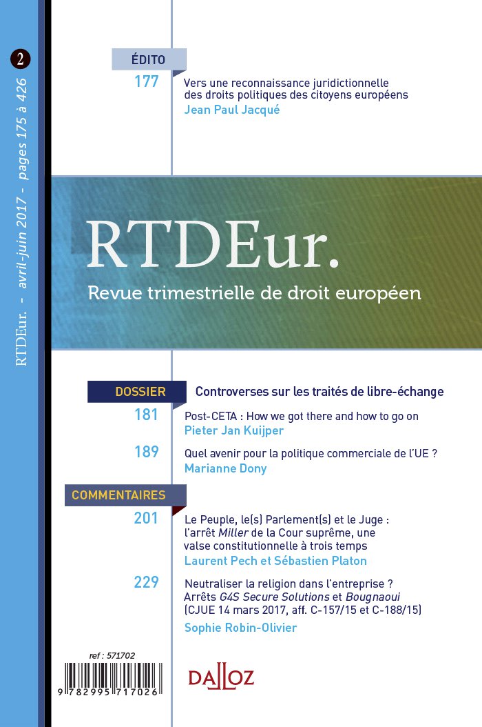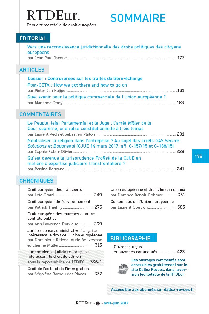 Vers une reconnaissance juridictionnelle des droits politiques des citoyens européens par Jean Paul Jacqué . 177 Dossier : Controverses sur les traités de libre- échange Post- CETA : How we got there and how to go on par Pieter Jan Kuijper . 181 Quel avenir pour la politique commerciale de l’Union européenne ? par Marianne Dony . 189 Le Peuple, le( s) Parlement( s) et le Juge : l’arrêt Miller de la Cour suprême, une valse constitutionnelle à trois temps par Laurent Pech et Sébastien Platon . 201 Neutraliser la religion dans l’entreprise ? Au sujet des arrêts G4S Secure Solutions et Bougnaoui ( CJUE 14 mars 2017, aff. C- 157/ 15 et C- 188/ 15 ) par Sophie Robin- Olivier . 229 Qu’est devenue la jurisprudence ProRail de la CJUE en matière d’expertise judiciaire transfrontalière ? par Perrine Bertrand . 241 ÉDITORIAL ARTICLES COMMENTAIRES Droit européen des transports par Loïc Grard . 249 Droit européen de l’environnement par Patrick Thieffry . 275 Droit européen des marchés et autres contrats publics par Ann Lawrence Durviaux . 299 Jurisprudence administrative française intéressant le droit de l’Union européenne par Dominique Ritleng, Aude Bouveresse et Etienne Muller . 313 Jurisprudence judiciaire française intéressant le droit de l’Union sous la reponsabilité de l’EDIEC . 336- 1 Droit de l’asile et de l’immigration par Ségolène Barbou des Places . 337 CHRONIQUES Union européenne et droits fondamentaux par Florence Benoît- Rohmer . 351 Contentieux de l’Union européenne par Laurent Coutron . 383 Ouvrages reçus et ouvrages commentés . 423 Les ouvrages commentés sont BIBLIOGRAPHIE