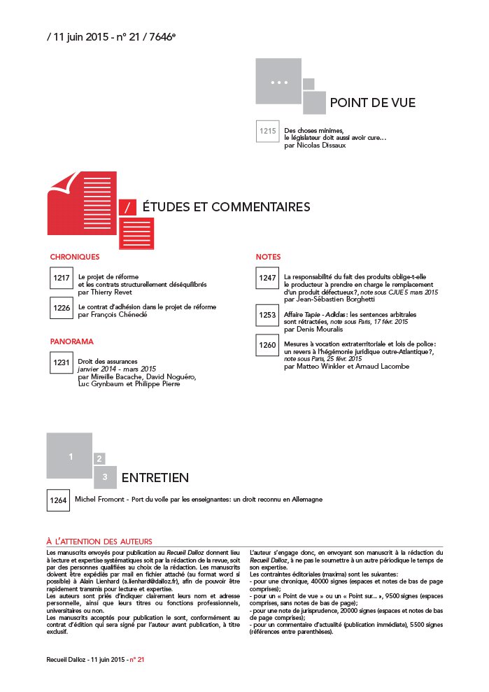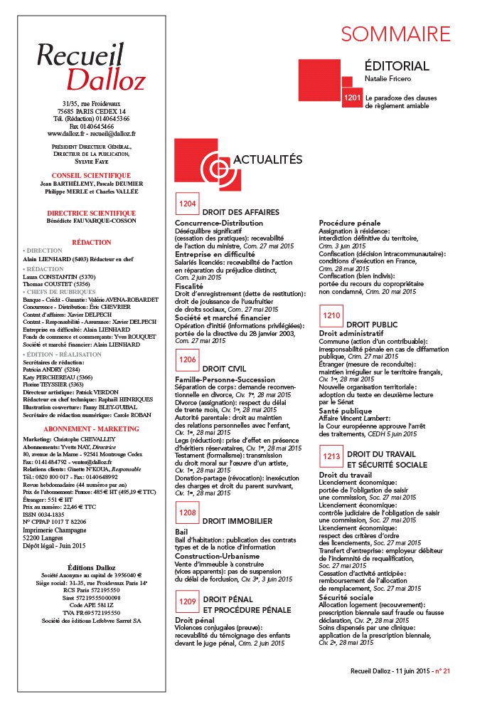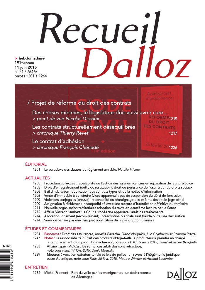 DROIT DES AFFAIRES Concurrence- Distribution Déséquilibre significatif ( cessation des pratiques): recevabilité de l’action du ministre, Com. 27 mai 2015 Entreprise en difficulté Salariés licenciés: recevabilité de l’action en réparation du préjudice distinct, Com. 2 juin 2015 Fiscalité Droit d’enregistrement ( dette de restitution): droit de jouissance de l’usufruitier de droits sociaux, Com. 27 mai 2015 Société et marché financier Opération d’initié ( informations privilégiées): portée de la directive du 28 janvier 2003, Com. 27 mai 2015 DROIT CIVIL Famille- Personne- Succession Séparation de corps: demande reconven-tionnelle en divorce, Civ. 1re, 28 mai 2015 Divorce ( assignation): respect du délai de trente mois, Civ. 1re, 28 mai 2015 Autorité parentale: droit au maintien des relations personnelles avec l’enfant, Civ. 1re, 28 mai 2015 Legs ( réduction): prise d’effet en présence d’héritiers réservataires, Civ. 1re, 28 mai 2015 Testament ( formalisme): transmission du droit moral sur l’oeuvre d’un artiste, Civ. 1re, 28 mai 2015 Donation- partage ( révocation): inexécution des charges et droit du parent survivant, Civ. 1re, 28 mai 2015 DROIT IMMOBILIER Bail Bail d’habitation: publication des contrats types et de la notice d’information Construction- Urbanisme Vente d’immeuble à construire ( vices apparents): pas de suspension du délai de forclusion, Civ. 3e, 3 juin 2015 DROIT PÉNAL ET PROCÉDURE PÉNALE Droit pénal Violences conjugales ( preuve): recevabilité du témoignage des enfants devant le juge pénal, Crim. 2 juin 2015 1204 1206 1208 1209 ACTUALITÉS Recueil Dalloz - 11 juin 2015 - n ° 21 SOMMAIRE Procédure pénale Assignation à résidence: interdiction définitive du territoire, Crim. 3 juin 2015 Confiscation ( décision intracommunautaire): conditions d’exécution en France, Crim. 28 mai 2015 Confiscation ( bien indivis): portée du recours du copropriétaire non condamné, Crim. 20 mai 2015 DROIT PUBLIC Droit administratif Commune ( action d’un contribuable): irresponsabilité pénale en cas de diffamation publique, Crim. 27 mai 2015 Étranger ( mesure de reconduite): maintien irrégulier sur le territoire français, Civ. 1re, 28 mai 2015 Nouvelle organisation territoriale: adoption du texte en deuxième lecture par le Sénat Santé publique Affaire Vincent Lambert: la Cour européenne approuve l'arrêt des traitements, CEDH 5 juin 2015 DROIT DU TRAVAIL ET SÉCURITÉ SOCIALE Droit du travail Licenciement économique: portée de l’obligation de saisir une commission, Soc. 27 mai 2015 Licenciement économique: contrôle judiciaire de l’obligation de saisir une commission, Soc. 27 mai 2015 Licenciement économique: respect des critères d’ordre des licenciements, Soc. 27 mai 2015 Transfert d’entreprise: employeur débiteur de l’indemnité de requalification, Soc. 27 mai 2015 Cessation d’activité anticipée: remboursement de l’allocation de remplacement, Soc. 27 mai 2015 Sécurité sociale Allocation logement ( recouvrement): prescription biennale sauf fraude ou fausse déclaration, Civ. 2e, 28 mai 2015 Soins dispensés par une clinique: application de la prescription biennale, Civ. 2e, 28 mai 2015 1210 1213 ÉDITORIAL Natalie Fricero Le paradoxe des clauses de règlement amiable 1201 / 11 juin 2015 - n ° 21 / 7646e . POINT DE VUE Des choses minimes, le législateur doit aussi avoir cure… par Nicolas Dissaux 1215 CHRONIQUES Le projet de réforme et les contrats structurellement déséquilibrés par Thierry Revet Le contrat d’adhésion dans le projet de réforme par François Chénedé PANORAMA Droit des assurances janvier 2014 - mars 2015 par Mireille Bacache, David Noguéro, Luc Grynbaum et Philippe Pierre 1217 1226 1231 ÉTUDES ET COMMENTAIRES / NOTES La responsabilité du fait des produits oblige- t- elle le producteur à prendre en charge le remplacement d’un produit défectueux?, note sous CJUE 5 mars 2015 par Jean- Sébastien Borghetti Affaire Tapie - Adidas: les sentences arbitrales sont rétractées, note sous Paris, 17 févr. 2015 par Denis Mouralis Mesures à vocation extraterritoriale et lois de police: un revers à l’hégémonie juridique outre- Atlantique?, note sous Paris, 25 févr. 2015 par Matteo Winkler et Arnaud Lacombe 1247 1253 1260 1 2 3 ENTRETIEN Michel Fromont - Port du voile par les enseignantes: un droit reconnu en Allemagne 1264
