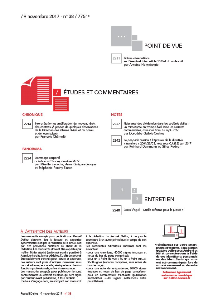 DROIT DES AFFAIRES Consommation Prescription biennale: application à une vente en l’état futur d’achèvement, Civ. 3e, 26 oct. 2017 Entreprise en difficulté Procédures d’insolvabilité ( règlement révisé): ordonnance d’adaptation du droit français DROIT CIVIL Contrat- Responsabilité- Assurance Vente à vil prix ( appréciation): prise en compte de la valeur à la date de la cession, Com. 25 oct. 2017 Famille- Personne- Succession Libéralités ( réduction): qualité à agir des ayants cause de l’héritier réservataire, Civ. 1re, 25 oct. 2017 Donation ( révocation pour ingratitude): point de départ du délai de prescription, Civ. 1re, 25 oct. 2017 Succession ( héritier réservataire): preuve du commencement d’exécution du testament, Civ. 1re, 25 oct. 2017 Succession ( conjoint survivant): libéralités reçues du défunt en présence de descen-dants, Civ. 1re, 25 oct. 2017 DROIT IMMOBILIER Construction- Urbanisme Assurance construction ( ouvrages existants): désordres relevant de la garantie décennale, Civ. 3e, 26 oct. 2017 2204 2206 2207 DROIT PÉNAL ET PROCÉDURE PÉNALE Droit pénal Trafic d’influence: obtention d’une décision favorable d’une administration, Crim. 25 oct. 2017 DROIT PUBLIC Droit administratif Accès à l’université: présentation du « plan Étudiants » DROIT DU TRAVAIL ET SÉCURITÉ SOCIALE Droit du travail Licenciement disciplinaire: appréciation du caractère réel et sérieux, Soc. 25 oct. 2017 Contrat d’apprentissage ( rupture): conclusion d’un contrat pour achever la formation, Soc. 25 oct. 2017 PROCÉDURE CIVILE ET VOIE D’EXÉCUTION Profession juridique et judiciaire Avocat ( honoraires): point de départ de la prescription de l’action en paiement, Civ. 2e, 26 oct. 2017 2208 2209 2209 2208 CHRONIQUE Interprétation et amélioration du nouveau droit des contrats ( À propos de quelques observations de la Direction des affaires civiles et du Sceau et de leurs suites) par François Chénedé PANORAMA Dommage corporel octobre 2016 - septembre 2017 par Mireille Bacache, Anne Guégan- Lécuyer et Stéphanie Porchy- Simon 2214 2224 COMMENTAIRES 1 2 3 ENTRETIEN NOTES Naissance des dividendes dans les sociétés civiles: un mimétisme en trompe- l’oeil avec les sociétés commerciales, note sous Com. 13 sept. 2017 par Dorothée Gallois- Cochet Le pre- pack cession à l’épreuve de la directive « transfert » 2001/ 23/ CE, note sous CJUE 22 juin 2017 par Reinhard Dammann et Gilles Podeur 2237 2242 Louis Vogel - Quelle réforme pour la justice? 2248 . POINT DE VUE Brèves observations sur l’éventuel futur article 1304- 4 du code civil par Antoine Hontebeyrie 2211