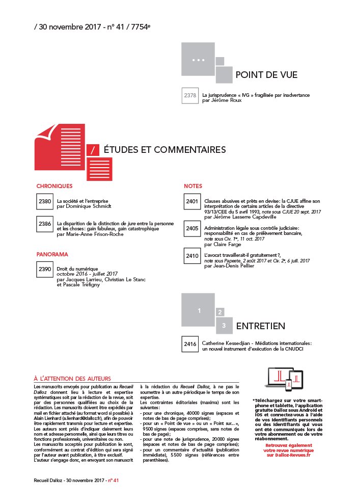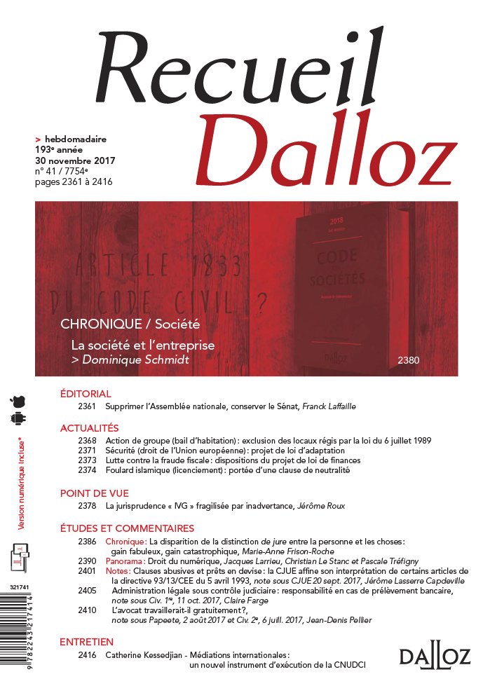 DROIT DES AFFAIRES Contrat d’affaires Autorité de contrôle des nuisances aéroportuaires: inconstitutionnalité du régime, Cons. const., 24 nov. 2017 Entreprise en difficulté Bail commercial ( clause résolutoire): loyers échus après le jugement d’ouverture, Com. 15 nov. 2017 Vérification des créances ( office du juge): caractère sérieux d’une contestation du débiteur, Com. 15 nov. 2017 Liquidation judiciaire ( cession de bail): protection contre les clauses de solidarité , Com. 15 nov. 2017 Saisie pénale immobilière: contestation de la validité ou de l’opposabilité à la procédure, Com. 15 nov. 2017 Plan de sauvegarde ( jugement d’arrêté): recevabilité d’une tierce opposition d’un créancier, Com. 15 nov. 2017 Déclaration d’insaisissabilité ( publicité irrégulière): qualité à agir du liquidateur, Com. 15 nov. 2017 DROIT CIVIL Famille- Personne- Succession Divorce ( prestation compensatoire): conditions pour ordonner une mesure d’instruction, Civ. 1re, 15 nov. 2017 Mineur étranger ( refus de placement): office du juge des enfants, Civ. 1re, 16 nov. 2017 Majeur sous tutelle ( PACS): contrôle de l’autorisation du juge des tutelles, Civ. 1re, 15 nov. 2017 Participation aux acquêts: contenus des patrimoines originaire et final, Civ. 1re, 15 nov. 2017 DROIT IMMOBILIER Bail Bail d’habitation ( action de groupe): exclusion des locaux régis par la loi du 6 juillet 1989, Paris, 9 nov. 2017 DROIT PÉNAL ET PROCÉDURE PÉNALE Droit pénal Infraction routière ( stationnement): condamnation d’un mineur âgé de cinq ans, Crim. 14 nov. 2017 2364 2366 2368 2369 Infraction routière ( stationnement): carte d’invalidité et place réservée aux livraisons, Crim. 14 nov. 2017 Procédure pénale Géolocalisation d’un véhicule ( irrégularité): non- renvoi d’une QPC, Crim. 14 nov. 2017 Appel ( partie civile): compétence de la cour d’appel ou de la juridiction administrative, Crim. 14 nov. 2017 DROIT PUBLIC Droit administratif Sécurité ( droit de l’Union européenne): projet de loi d’adaptation Orientation et réussite des étudiants: présentation d’un projet de loi Fiscalité Lutte contre la fraude fiscale: dispositions du projet de loi de finances Santé publique Hospitalisation d’office ( maintien): fermeture au tiers du pourvoi en cassation, Civ. 1re, 15 nov. 2017 DROIT DU TRAVAIL ET SÉCURITÉ SOCIALE Droit du travail Foulard islamique ( licenciement): portée d’une clause de neutralité, Soc. 22 nov. 2017 Principe de non- discrimination ( âge): indemnité en cas de nullité du licenciement, Soc. 15 nov. 2017 Comité d’entreprise ( consultation): délai en cas de saisine du CHSCT, Soc. 15 nov. 2017 Sécurité sociale Cotisations sociales ( jeunes entreprises innovantes): constitutionnalité du régime, Cons. const., 24 nov. 2017 Travail illégal ( infraction): exercice du droit de communication des organismes sociaux, Civ. 2e, 9 nov. 2017 PROCÉDURE CIVILE ET VOIE D’EXÉCUTION Procédure civile Appel ( déclaration au greffe): limite à la transmission par voie électronique, Civ. 2e, 16 nov. 2017 Partage judiciaire ( Alsace- Moselle): représentation des parties et homologation, Civ. 2e, 16 nov. 2017 Conciliation préalable ( contrat d’architecte): qualification et portée de la clause, Civ. 3e, 16 nov. 2017 2371 2374 2376 CHRONIQUES La société et l’entreprise par Dominique Schmidt La disparition de la distinction de jure entre la personne et les choses: gain fabuleux, gain catastrophique par Marie- Anne Frison- Roche PANORAMA Droit du numérique octobre 2016 - juillet 2017 par Jacques Larrieu, Christian Le Stanc et Pascale Tréfigny 2380 2386 2390 1 2 3 ENTRETIEN NOTES Clauses abusives et prêts en devise: la CJUE affine son interprétation de certains articles de la directive 93/ 13/ CEE du 5 avril 1993, note sous CJUE 20 sept. 2017 par Jérôme Lasserre Capdeville Administration légale sous contrôle judiciaire: responsabilité en cas de prélèvement bancaire, note sous Civ. 1re, 11 oct. 2017 par Claire Farge L’avocat travaillerait- il gratuitement?, note sous Papeete, 2 août 2017 et Civ. 2e, 6 juill. 2017 par Jean- Denis Pellier 2401 2405 2410 Catherine Kessedjian - Médiations internationales: un nouvel instrument d’exécution de la CNUDCI 2416