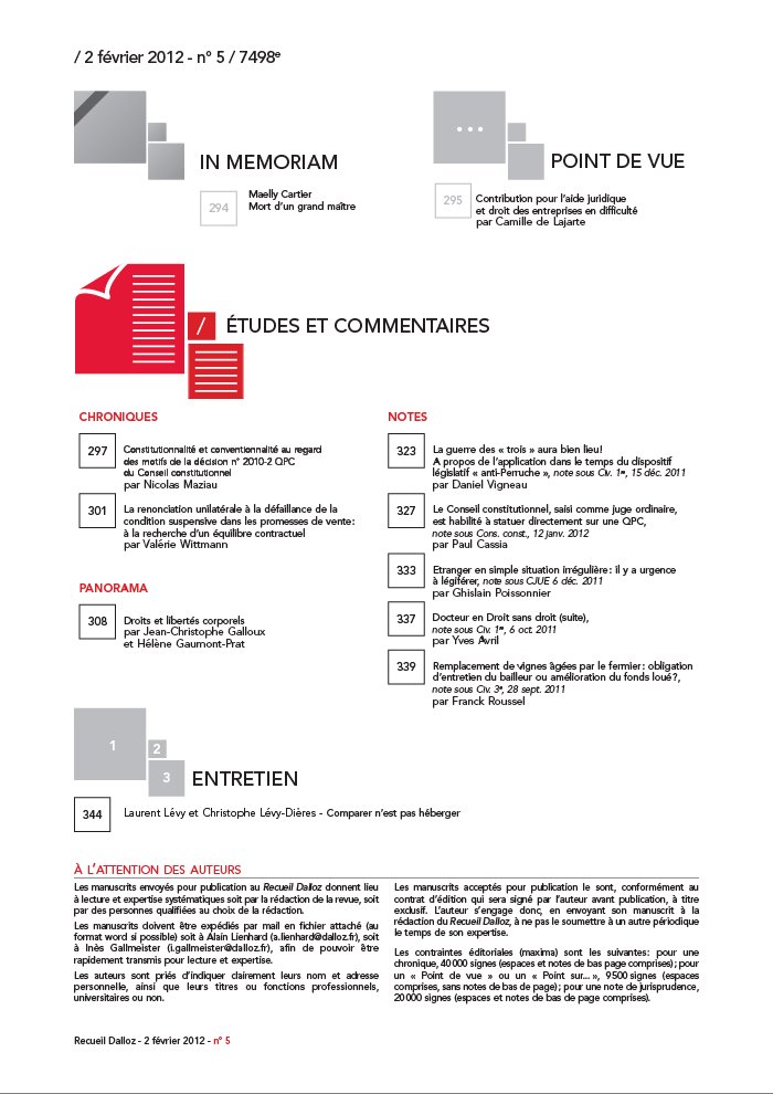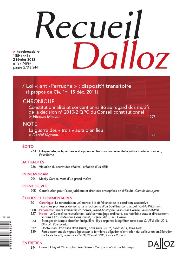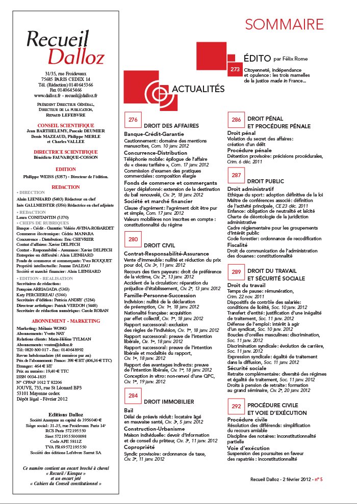 SOMMAIRE DROIT DES AFFAIRES Banque- Crédit- Garantie Cautionnement: domaine des mentions manuscrites, Com. 10 janv. 2012 Concurrence- Distribution Téléphonie mobile: épilogue de l’affaire du « ciseau tarifaire » , Com. 17 janv. 2012 Commission d’examen des pratiques commerciales: composition élargie Fonds de commerce et commerçants Loyer déplafonné: extension de la destination du bail renouvelé, Civ. 3e, 18 janv. 2012 Société et marché financier Clause d’agrément: l’agrément doit être pur et simple, Com. 17 janv. 2012 Valeurs mobilières non inscrites en compte : constitutionnalité du régime DROIT CIVIL Contrat- Responsabilité- Assurance Vente d’immeuble: nullité et réduction du prix pour dol, Civ. 3e, 11 janv. 2012 Recours des tiers payeurs: droit de préférence de la victime, Civ. 2e, 13 janv. 2012 Accident de la circulation: réparation du préjudice d’établissement, Civ. 2e, 13 janv. 2012 Famille- Personne- Succession Indivision: nullité de la déclaration de préemption, Civ. 1re, 18 janv. 2012 Nationalité française: acquisition par effet collectif, Civ. 1re, 18 janv. 2012 Rapport successoral: exclusion des règles de l’indivision, Civ. 1re, 18 janv. 2012 Rapport successoral: preuve de l’intention libérale, Civ. 1re, 18 janv. 2012 Rapport successoral: preuve de l’intention libérale et modalités du rapport, Civ. 1re, 18 janv. 2012 Rapport des avantages indirects: preuve de l’intention libérale, Civ. 1re, 18 janv. 2012 Conception in vitro: non- renvoi d’une QPC, Civ. 1re, 19 janv. 2012 DROIT IMMOBILIER Bail Délai de préavis réduit: locataire âgé en mauvaise santé, Civ. 3e, 5 janv. 2012 Construction- Urbanisme Maison individuelle: devoir d’information et de conseil du prêteur, Civ. 3e, 11 janv. 2012 Copropriété Syndic provisoire: ordonnance de taxe, Civ. 3e, 11 janv. 2012 DROIT PÉNAL ET PROCÉDURE PÉNALE Droit pénal Violation du secret des affaires: création d’un délit Procédure pénale Détention provisoire: précisions procédurales, Crim. 6 déc. 2011 DROIT PUBLIC Droit administratif Ethique du sport: adoption définitive de la loi Maître de conférences associé: définition de l’activité principale, CE 23 déc. 2011 Enfance: obligation de neutralité et laïcité Charte de déontologie de la juridiction administrative Cadre réglementaire pour les groupements d’intérêt public Code forestier: ordonnance de recodification Fiscalité Droit de communication de l’administration des douanes: constitutionnalité DROIT DU TRAVAIL ET SÉCURITÉ SOCIALE Droit du travail Temps de pause: rémunération, Crim. 22 nov. 2011 Dispositifs de contrôle des salariés: conditions de licéité, Soc. 10 janv. 2012 Transfert d’entité: justification d’une inégalité de traitement, Soc. 11 janv. 2012 Défense de l’emploi: intérêt à agir d’un syndicat, Soc. 10 janv. 2012 Boucles d’oreilles masculines: discrimination, Soc. 11 janv. 2012 Discrimination syndicale: évolution de carrière, Soc. 11 janv. 2012 Expression syndicale: égalité de traitement dans la diffusion, Soc. 11 janv. 2012 Sécurité sociale Retraite complémentaire: diversité des régimes et égalité de traitement, Soc. 11 janv. 2012 Droits à pension de retraite: formation au grand séminaire, Civ. 2e, 20 janv. 2012 PROCÉDURE CIVILE ET VOIE D’EXÉCUTION Procédure civile Résolution des différends: simplification du recours amiable Discipline des notaires: inconstitutionnalité partielle Voie d’exécution Suspension des poursuites en faveur des rapatriés : inconstitutionnalité 276 280 284 286 287 289 292 ACTUALITÉS ÉDITO par Félix Rome Citoyenneté, indépendance et opulence : les trois mamelles de la justice made in France. 273 CHRONIQUES Constitutionnalité et conventionnalité au regard des motifs de la décision n ° 2010- 2 QPC du Conseil constitutionnel par Nicolas Maziau La renonciation unilatérale à la défaillance de la condition suspensive dans les promesses de vente: à la recherche d’un équilibre contractuel par Valérie Wittmann PANORAMA Droits et libertés corporels par Jean- Christophe Galloux et Hélène Gaumont- Prat 297 301 308 ÉTUDES ET COMMENTAIRES 1 2 3 ENTRETIEN / NOTES La guerre des « trois » aura bien lieu! A propos de l’application dans le temps du dispositif législatif « anti- Perruche » , note sous Civ. 1re, 15 déc. 2011 par Daniel Vigneau Le Conseil constitutionnel, saisi comme juge ordinaire, est habilité à statuer directement sur une QPC, note sous Cons. const., 12 janv. 2012 par Paul Cassia Etranger en simple situation irrégulière: il y a urgence à légiférer, note sous CJUE 6 déc. 2011 par Ghislain Poissonnier Docteur en Droit sans droit ( suite), note sous Civ. 1re, 6 oct. 2011 par Yves Avril Remplacement de vignes âgées par le fermier: obligation d’entretien du bailleur ou amélioration du fonds loué?, note sous Civ. 3e, 28 sept. 2011 par Franck Roussel 323 327 333 337 339 Laurent Lévy et Christophe Lévy- Dières - Comparer n’est pas héberger 344 . POINT DE VUE Contribution pour l’aide juridique et droit des entreprises en difficulté par Camille de Lajarte 295 IN MEMORIAM Maelly Cartier Mort d’un grand maître 294